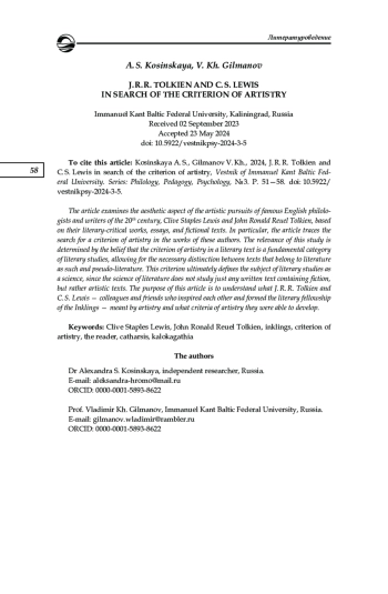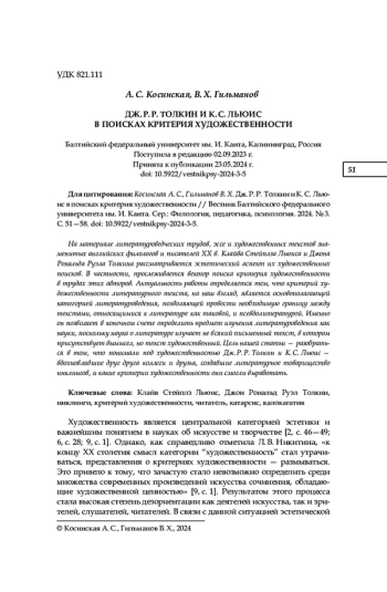 На материале литературоведческих трудов, эссе и художественных текстов знаменитых английских филологов и писателей ХХ в. Клайва Стейплза Льюиса и Джона Рональда Руэла Толкина рассматривается эстетический аспект их художественных поисков. В частности, прослеживается вектор поиска критерия художественности в трудах этих авторов. Актуальность работы определяется тем, что критерий художественности литературного текста, на наш взгляд, является основополагающей категорией литературоведения, позволяющей провести необходимую границу между текстами, относящимися к литературе как таковой, и псевдолитературой. Именно он позволяет в конечном счете определить предмет изучения литературоведения как науки, поскольку наука о литературе изучает не всякий письменный текст, в котором присутствует вымысел, но текст художественный. Цель нашей статьи — разобраться в том, что понимали под художественностью Дж. Р. Р. Толкин и К. С. Льюис — вдохновлявшие друг друга коллеги и друзья, создавшие литературное товарищество инклингов, и какие критерии художественности они смогли выработать