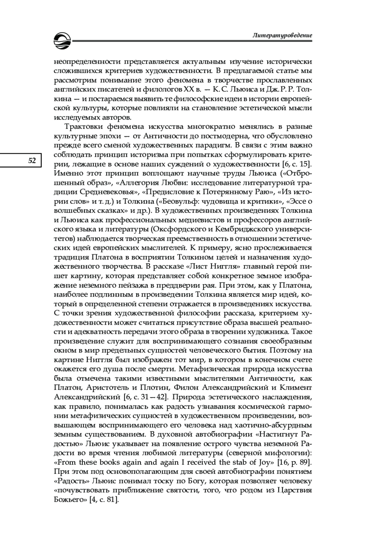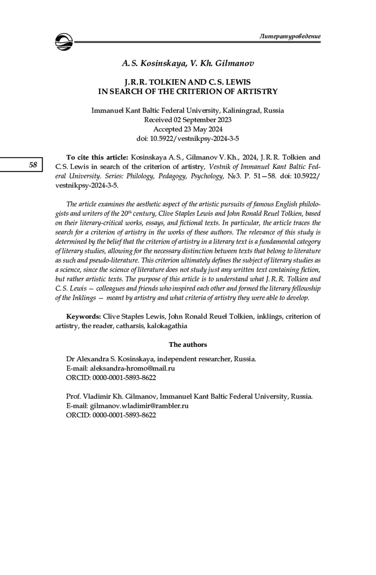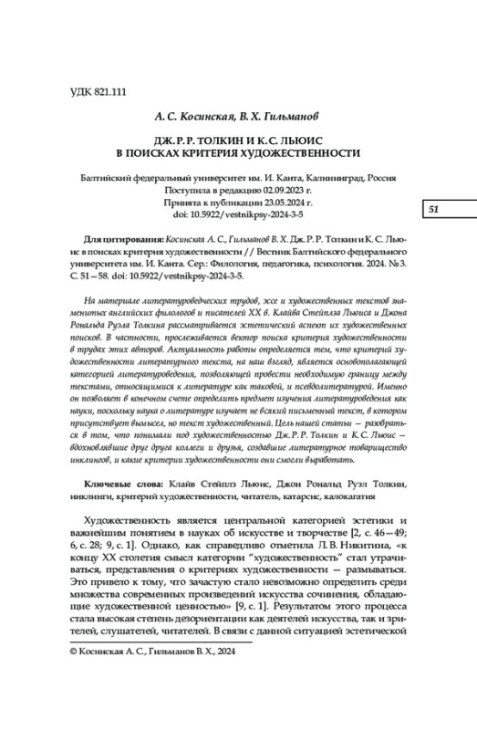 5. Косинская А. С. Рецептивная эстетика Клайва Стейплза Льюиса (к вопросу о критерии художественности) // Славянская культура: истоки, традиции, взаимодействие. XХII Кирилло-Мефодиевские чтения: материалы междунар. науч.-практ. конф. М., 2021. С. 233-238. EDN: KUFFOV