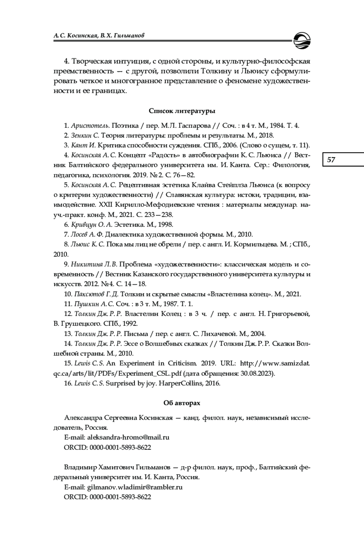 4. Косинская А. С. Концепт “Радость” в автобиографии К. С. Льюиса // Вестник Балтийского федерального университета им. И. Канта. Сер.: Филология, педагогика, психология. 2019. № 2. С. 76-82. EDN: SLDGFF