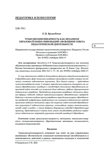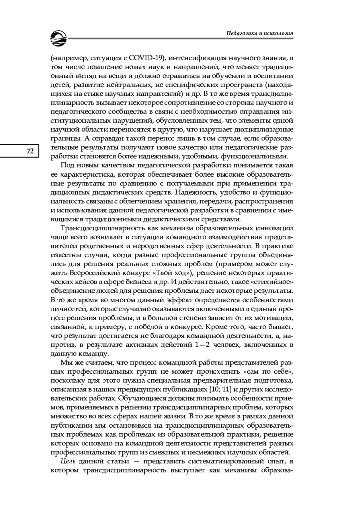 Трансдисциплинарность возникает как ответ на ряд современных жизненных обстоятельств: социально-экономическая нестабильность и невозможность действий в рамках имеющихся подходов и технологий (например, ситуация с COVID-19), интенсификация научного знания, в том числе появление новых наук и направлений, что меняет традиционный взгляд на вещи и должно отражаться на обучении и воспитании детей, развитие нейтральных, не специфических пространств (находящихся на стыке научных направлений) и др. В то же время трансдисциплинарность вызывает некоторое сопротивление со стороны научного и педагогического сообщества в связи с необходимостью оправдания институциональных нарушений, обусловленных тем, что элементы одной научной области переносятся в другую, что нарушает дисциплинарные границы. А оправдан такой перенос лишь в том случае, если образовательные результаты получают новое качество или педагогические разработки становятся более надежными, удобными, функциональными