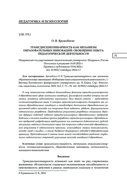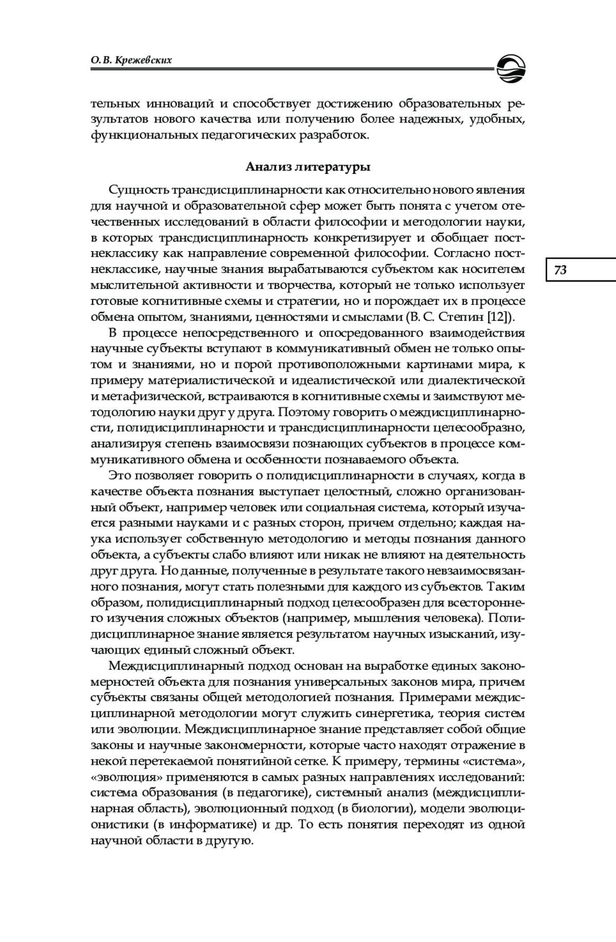 11. Крежевских О. В. Мультипрофессиональное образование будущих практических работников сферы дошкольного образования в свете концепции нелинейности // Педагогика. 2019. № 7. С. 57-64. EDN: LNSJCC