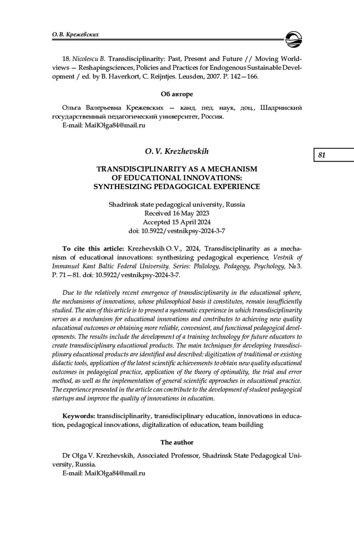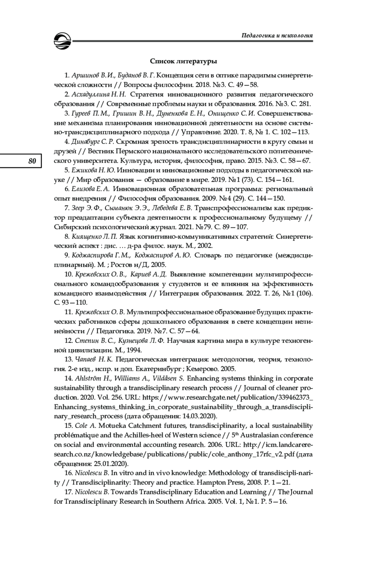 17. Nicolescu B. Towards Transdisciplinary Education and Learning // The Journal for Transdisciplinary Research in Southern Africa. 2005. Vol. 1, № 1. P. 5-16.