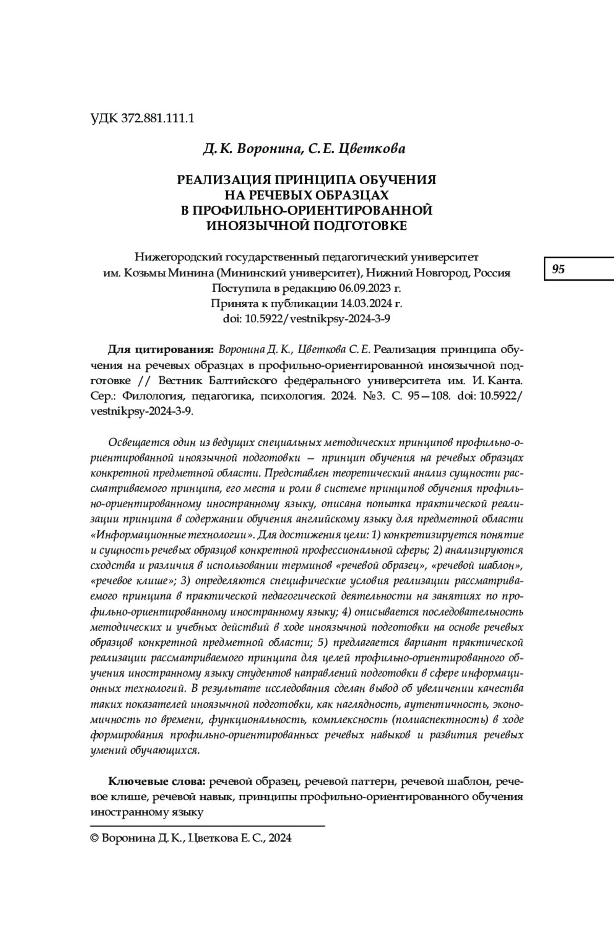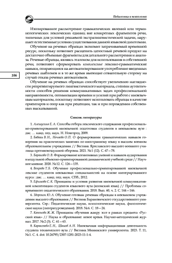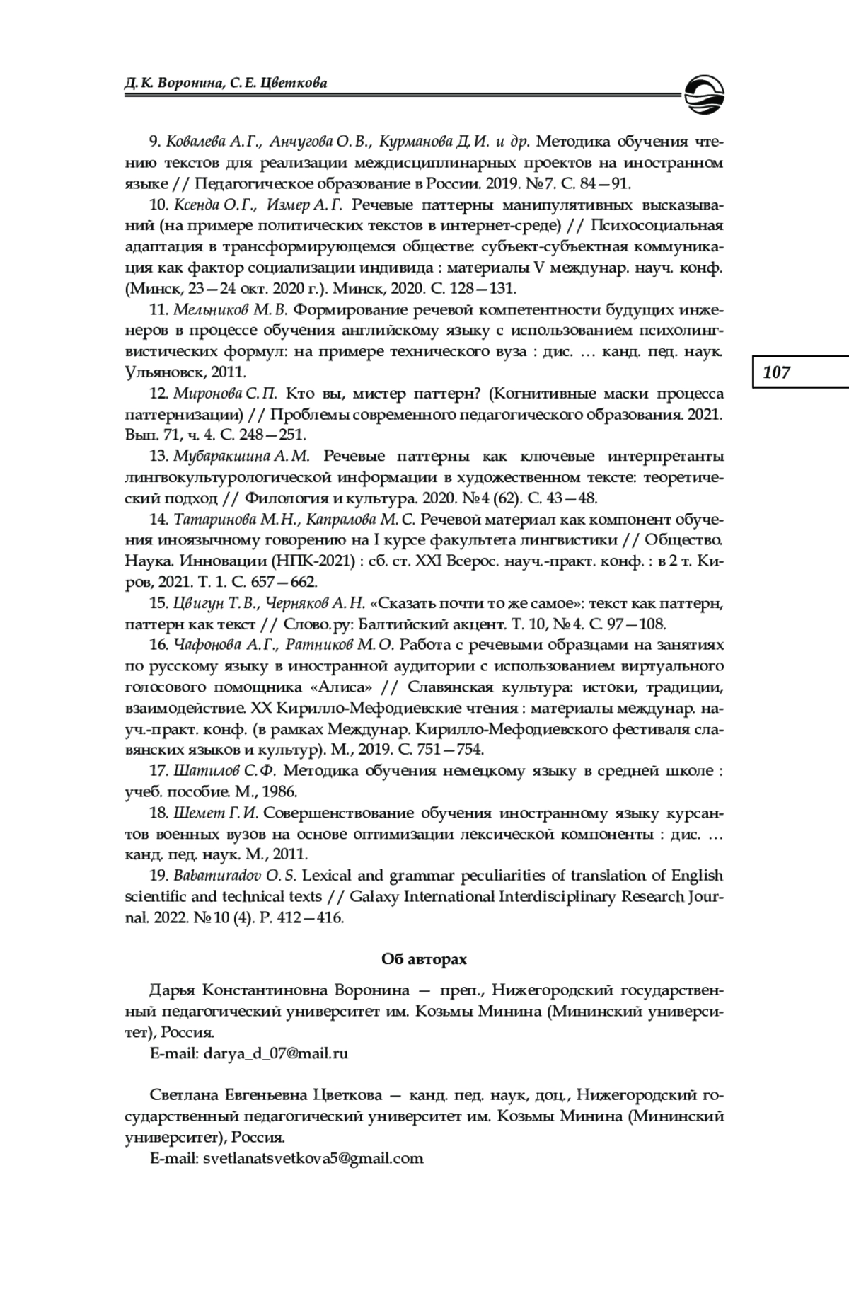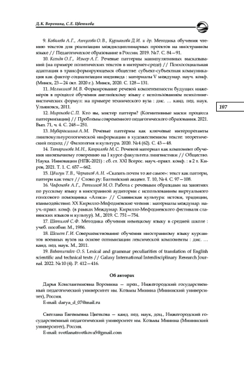 8. Каракозова Е. Н., Шамов А. Н. Иноязычная информационная деятельность студента технического вуза // Вестник Мининского университета. 2023. Т. 11, № 1. С. 4. DOI: 10.26795/2307-1281-2023-11-1-4 EDN: OERESG