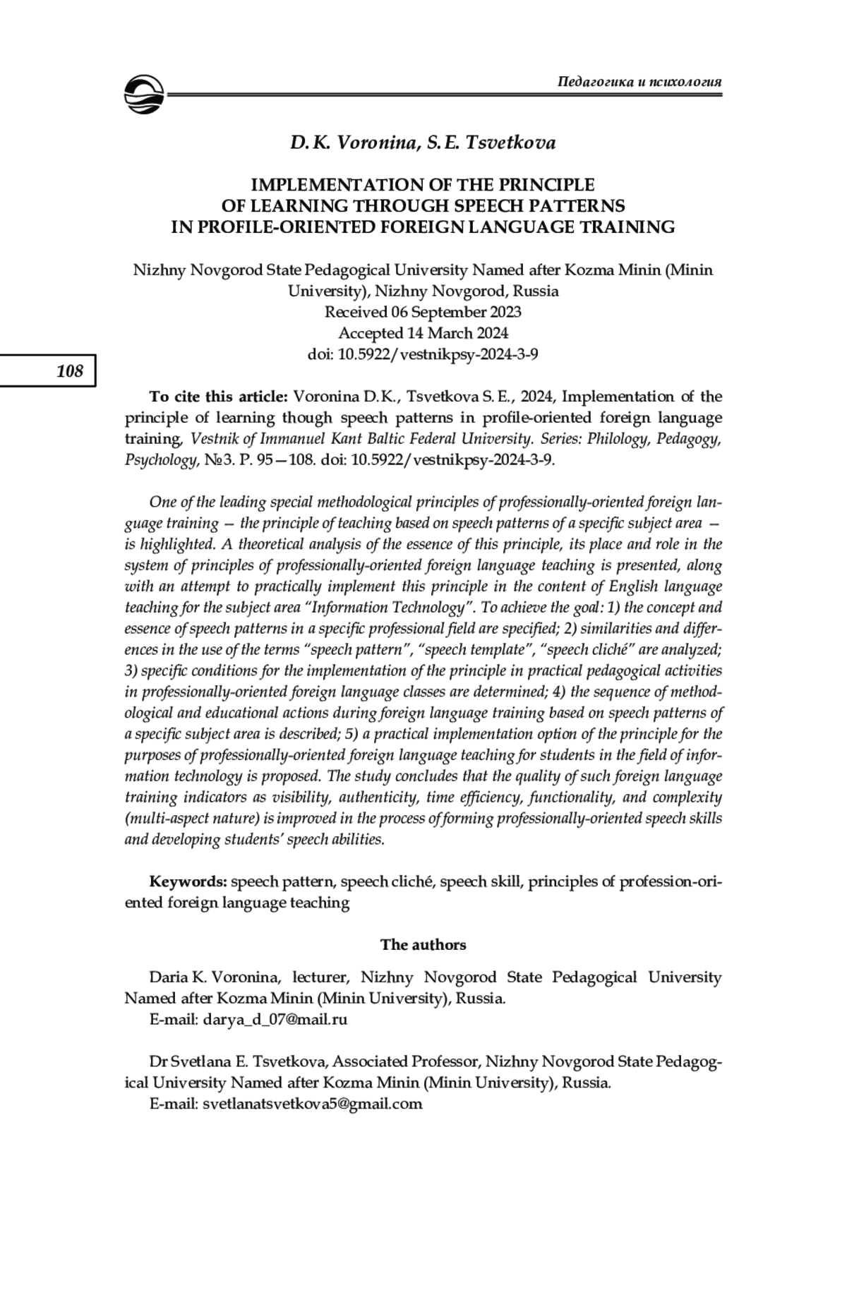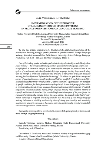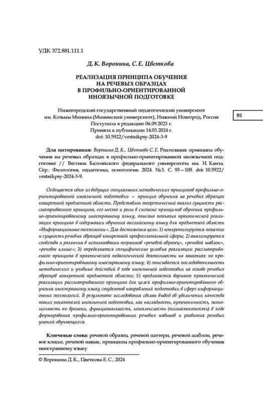 Освещается один из ведущих специальных методических принципов профильно-ориентированной иноязычной подготовки — принцип обучения на речевых образцах конкретной предметной области. Представлен теоретический анализ сущности рассматриваемого принципа, его места и роли в системе принципов обучения профильно-ориентированному иностранному языку, описана попытка практической реализации принципа в содержании обучения английскому языку для предметной области «Информационные технологии». Для достижения цели: 1) конкретизируется понятие и сущность речевых образцов конкретной профессиональной сферы; 2) анализируются сходства и различия в использовании терминов «речевой образец», «речевой шаблон», «речевое клише»; 3) определяются специфические условия реализации рассматриваемого принципа в практической педагогической деятельности на занятиях по профильно-ориентированному иностранному языку; 4) описывается последовательность методических и учебных действий в ходе иноязычной подготовки на основе речевых образцов конкретной предметной области; 5) предлагается вариант практической реализации рассматриваемого принципа для целей профильно-ориентированного обучения иностранному языку студентов направлений подготовки в сфере информационных технологий. В результате исследования сделан вывод об увеличении качества таких показателей иноязычной подготовки, как наглядность, аутентичность, экономичность по времени, функциональность, комплексность (полиаспектность) в ходе формирования профильно-ориентированных речевых навыков и развития речевых умений обучающихся