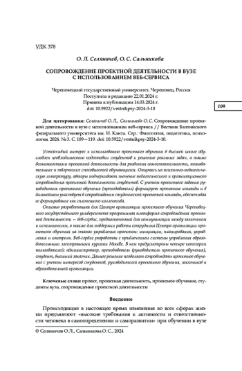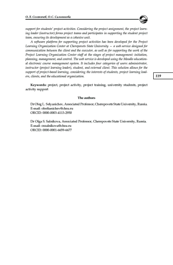 Устойчивый интерес к использованию проектного обучения в высшей школе обусловлен необходимостью подготовки студентов к решению реальных задач, а также возможностями проектной деятельности для развития самостоятельности, познавательных и творческих способностей обучающихся. Опираясь на психолого-педагогическую литературу, авторы подчеркивают значение педагогического и организационного сопровождения проектной деятельности студентов. С учетом проектного задания руководитель проектного обучения (преподаватель) формирует проектные команды и в дальнейшем участвует в сопровождении студенческой проектной команды, обеспечивая ее формирование как сплоченного коллектива. Описана разработанная для Центра организации проектного обучения Череповецкого государственного университета программная платформа сопровождения проектной деятельности — веб-сервис, предназначенный для коммуникации между заказчиком и исполнителем, а также для поддержки работы сотрудника Центра организации проектного обучения на этапах управления проектом: инициации, планирования, управления и контроля. Веб-сервис разработан с привлечением системы управления образовательными электронными курсами Moodle. В нем предусмотрены четыре категории пользователей: администратор, преподаватель (руководитель проектного обучения), студент, внешний заказчик. Данное решение позволяет сопровождать проектное обучение с учетом интересов студентов, руководителей проектного обучения, заказчиков и образовательной организации