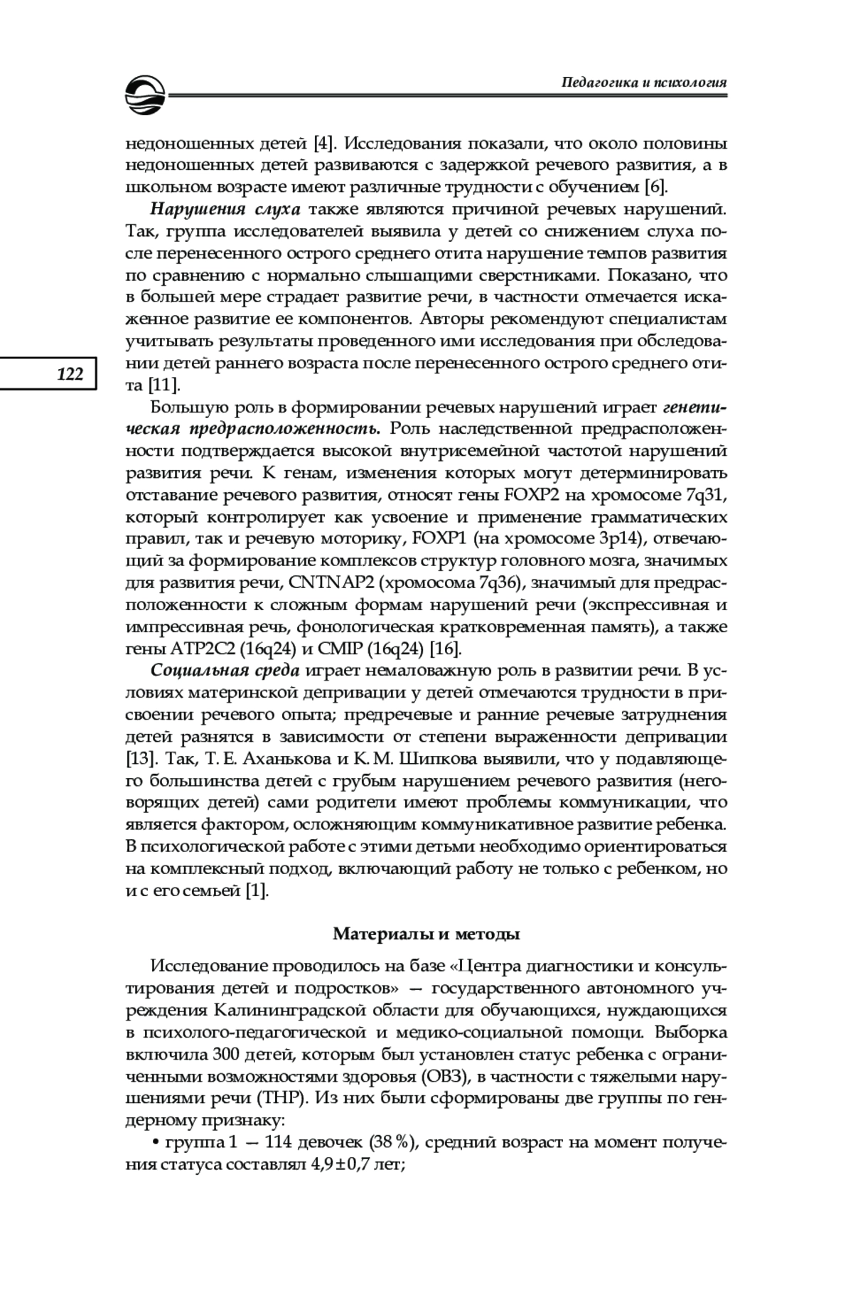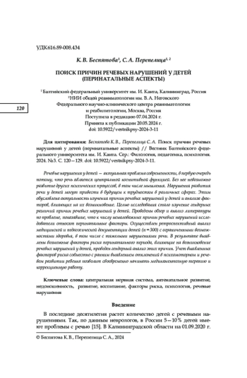 В последние десятилетия растет количество детей с речевыми нарушениями. Так, по данным неврологов, в России 5—10 % детей имеют проблемы с речью [15]. В Калининградской области на 01.09.2020 г. в дошкольных образовательных учреждениях обучалось 1137 человек с тяжелыми нарушениями речи [12]. Речь является одной из центральных когнитивных функций, без участия которой невозможно развитие остальных психических процессов, в том числе и мышления. Нарушения развития речи у детей в будущем могут привести к трудностям в овладении школьными навыками, такими как чтение, письмо [8], а также в поведенческой и эмоциональной сферах [14]. К возможным причинам речевых нарушений у детей относят различные факторы.