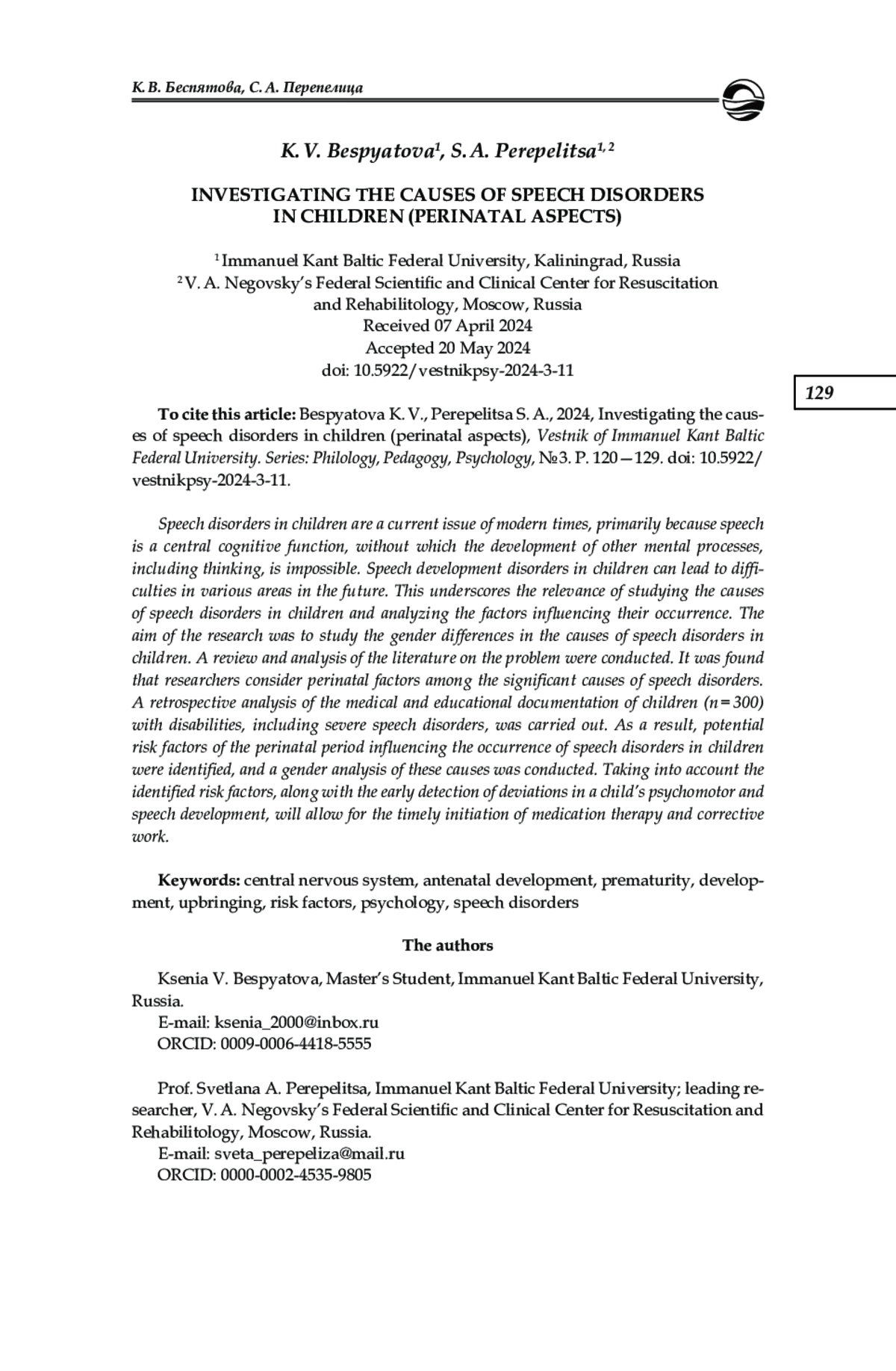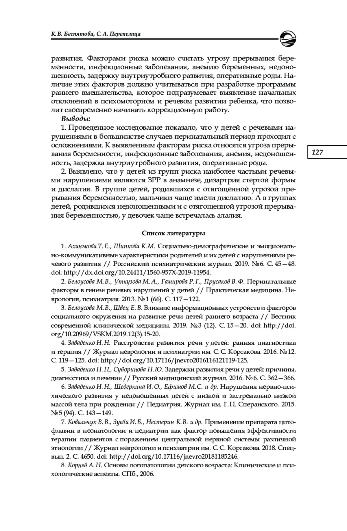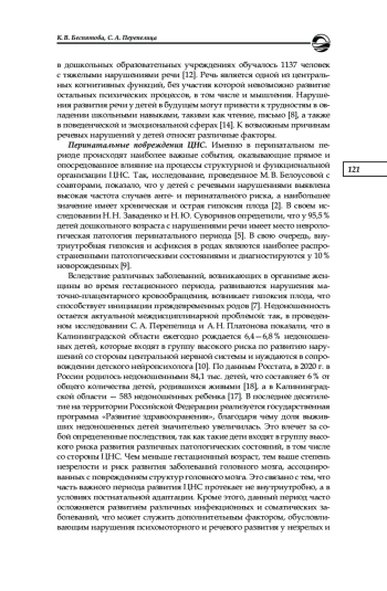 2. Белоусова М. В., Уткузова М. А., Гамирова Р. Г., Прусаков В. Ф. Перинатальные факторы в генезе речевых нарушений у детей // Практическая медицина. Неврология, психиатрия. 2013. № 1 (66). С. 117-122. EDN: PYQEHN