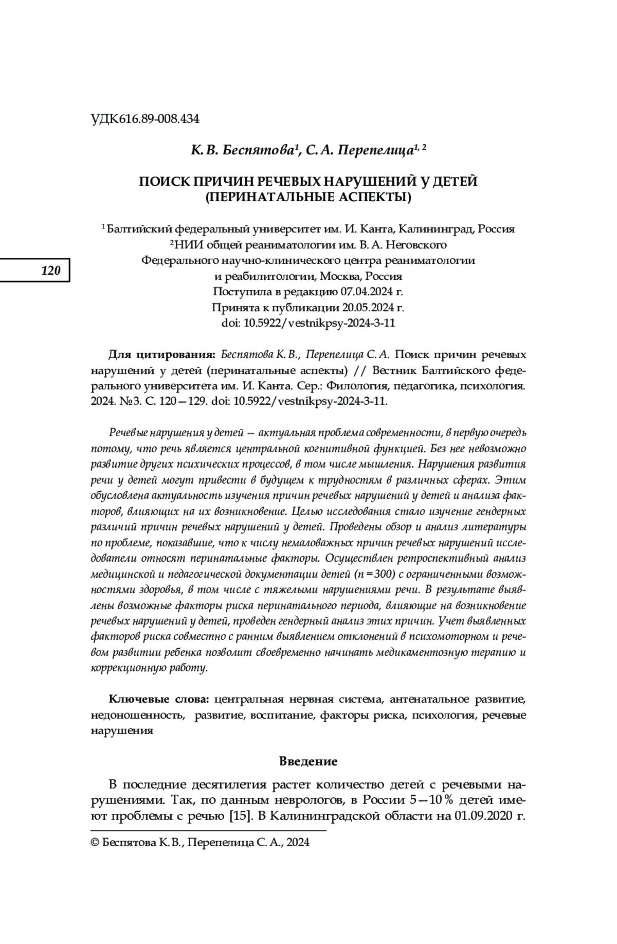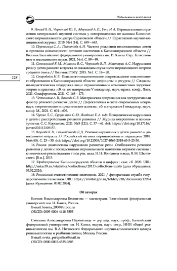 10. Перепелица С. А., Платонова А. Н. Частота рождения недоношенных детей и причины инвалидности детского населения в Калининградской области // Вестник Балтийского федерального университета им. И. Канта. Сер.: Естественные и медицинские науки. 2021. № 4. С. 89-99. EDN: DOPJLS