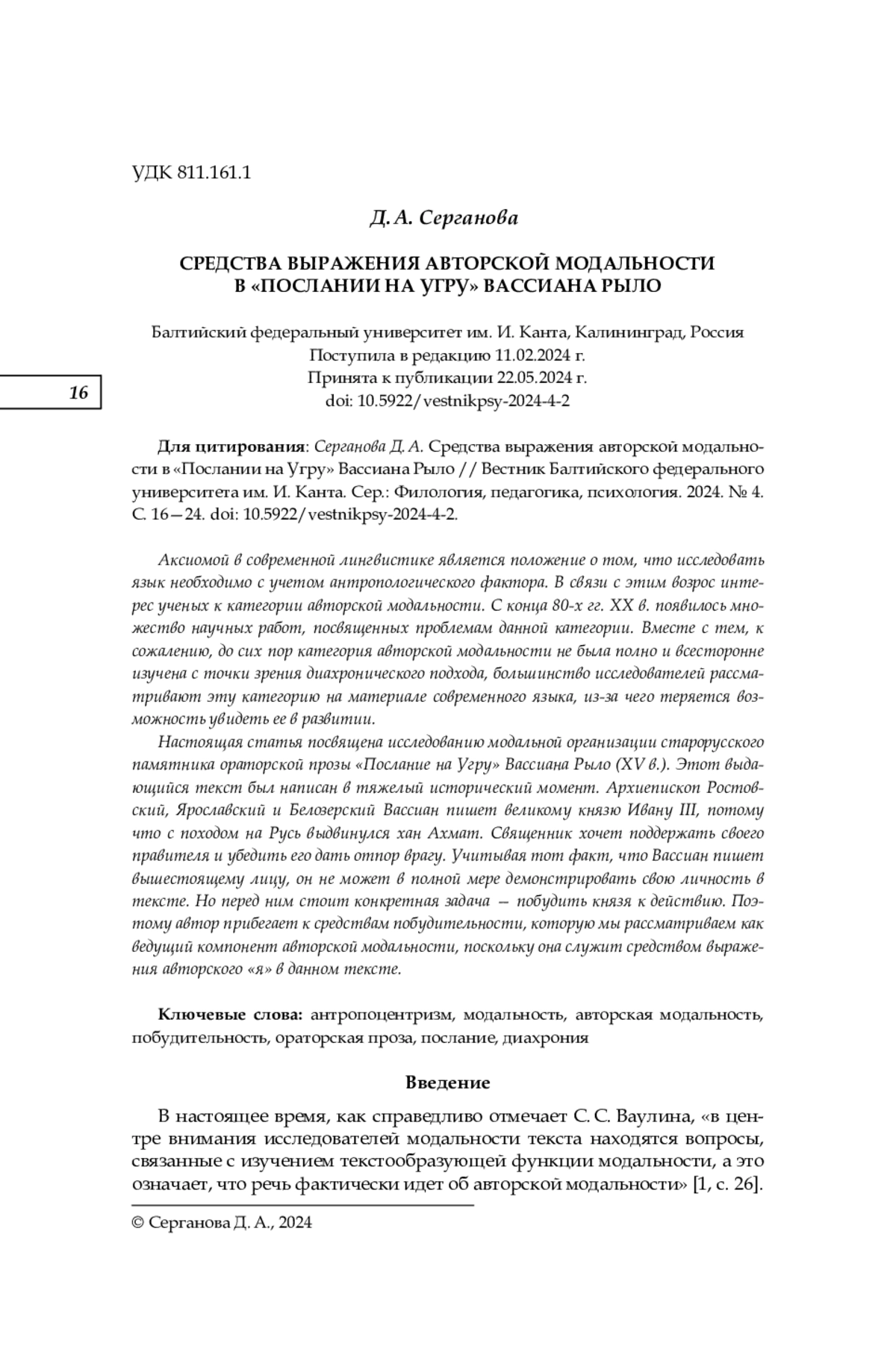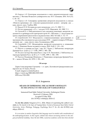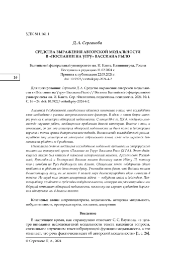 2. Ваулина С. С., Серганова Д. А. Модальность как способ раскрытия личности автора памятника древнерусской письменности “Поучение Владимира Мономаха” // Вестник Балтийского федерального университета им. И. Канта. Сер.: Филология, педагогика, психология. 2021. № 1. С. 12-18. EDN: WQTTVP