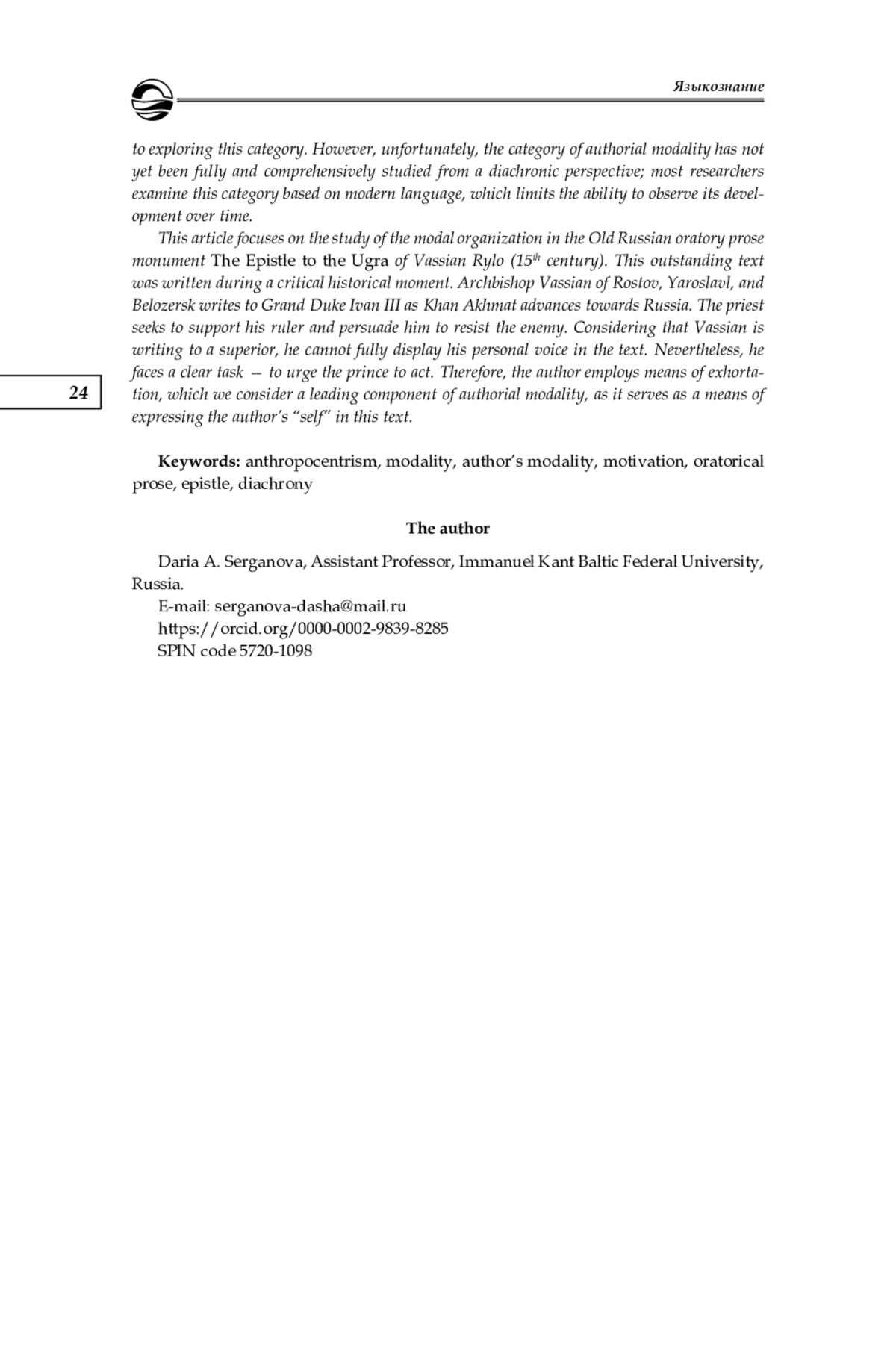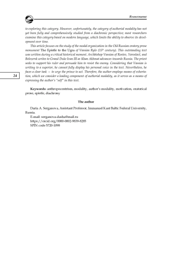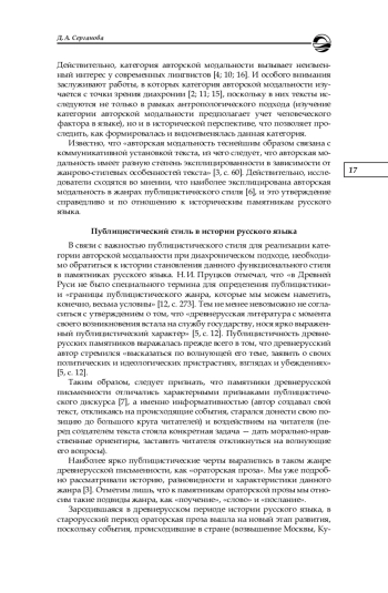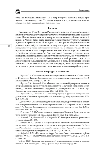 14. Серганова Д. А. Побудительность как ключевой компонент авторской модальности в древнерусской ораторской прозе XI-XIII веков // Актуальные вопросы современной филологии и журналистики. 2022. № 3 (46). С. 72-77.