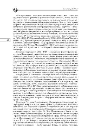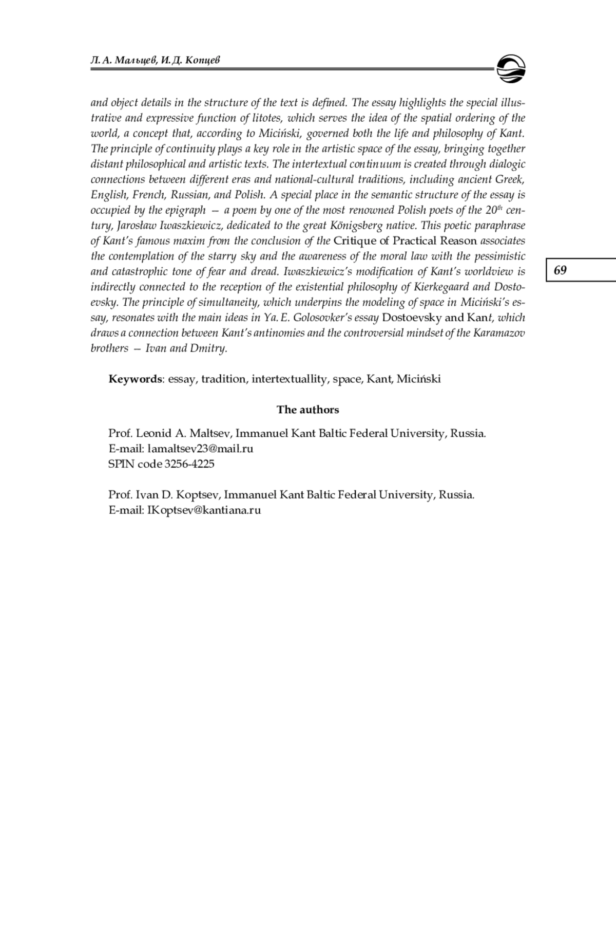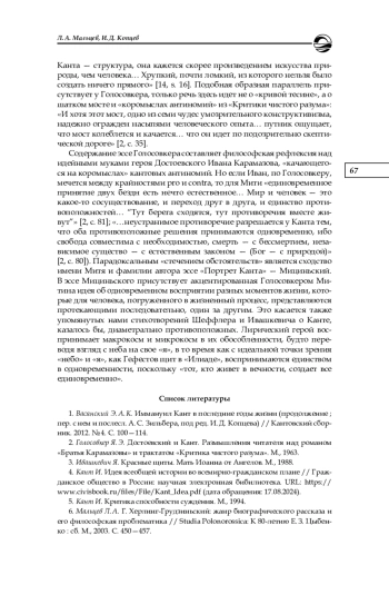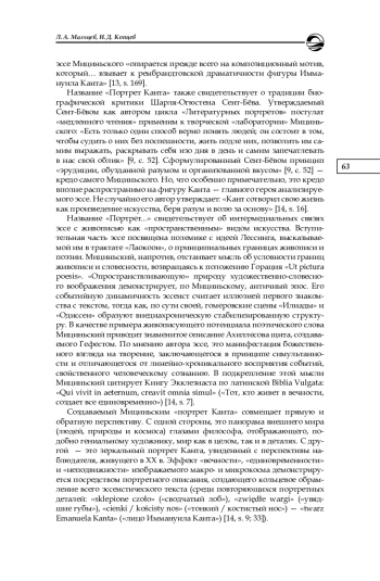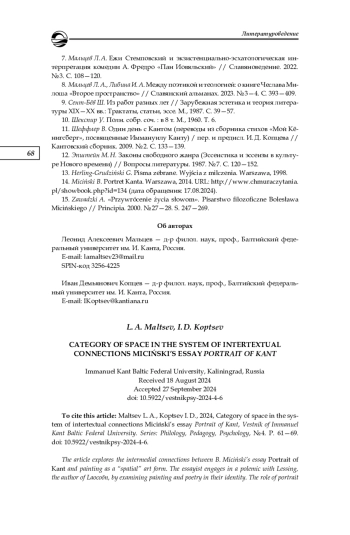 Рассматриваются интермедиальные связи эссе Б. Мициньского «Портрет Канта» с живописью как «пространственным» видом искусства. Эссеист полемизирует с Лессингом как автором трактата «Лаокоон», рассматривая живопись и поэзию в их тождестве. Определяется роль портретных и предметных деталей в структуре текста. Показана особая изобразительно-выразительная функция литоты, служащая идее пространственного упорядочивания мира, которой, по мнению Мициньского, была подчинена жизнь и философия Канта. В художественном пространстве эссе кардинальную роль играет принцип непрерывности, состоящий в сближении далеких друг от друга философских и художественных текстов. Интертекстуальный континуум образуется с помощью диалогических связей между разными эпохами и национально-культурными традициями, в том числе древнегреческой, английской, французской, русской, польской. Особое место в смысловой структуре эссе «Портрет Канта» занимает эпиграф — стихотворение одного из известнейших польских поэтов ХХ в. Ярослава Ивашкевича, посвященное Канту и представляющее собой поэтический парафраз знаменитой максимы Канта из заключения «Критики практического разума». Созерцание звездного неба и осознание морального закона сопряжены у Ивашкевича с пессимистически-катастрофической тональностью страха и ужаса. Модификация кантовской картины мира у Ивашкевича опосредованно связана с рецепцией экзистенциальной философии Кьеркегора и Достоевского. Принцип одновременности, являющийся основой моделирования пространства в эссе Мициньского, образует перекличку с основными идеями эссе Я. Э. Голосовкера «Достоевский и Кант», в котором проводится связь между антиномиями Канта и контроверсивным складом мышления братьев Карамазовых — Ивана и Дмитрия