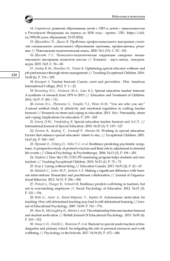 19. Brunsting N. C., Sreckovic M. A., Lane K. L. Special education teacher burnout: A synthesis of research from 1979 to 2013 // Education and Treatment of Children. 2014. № 37. P. 681-711.