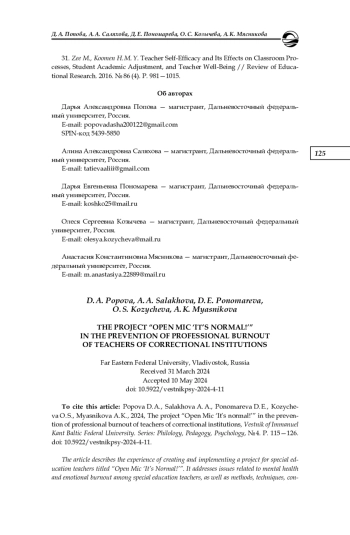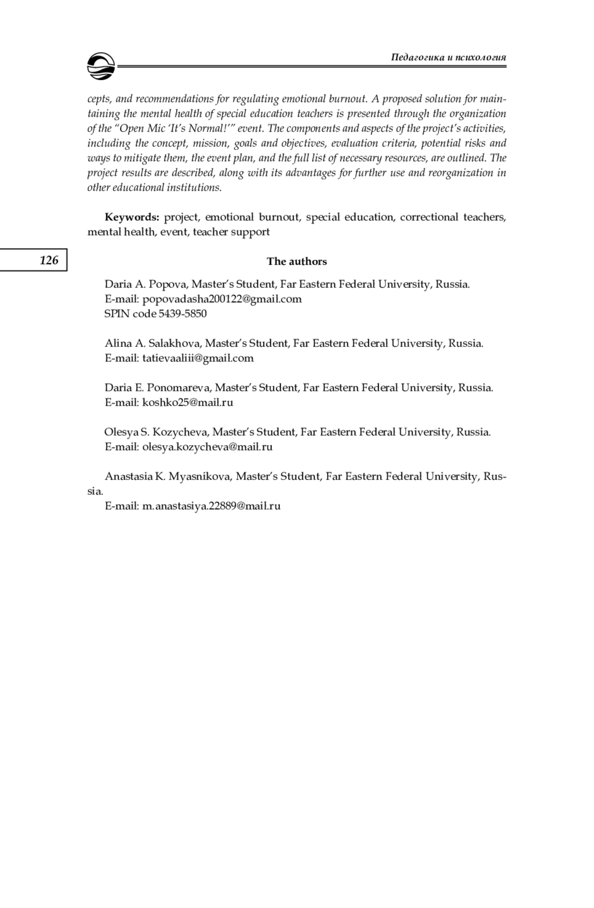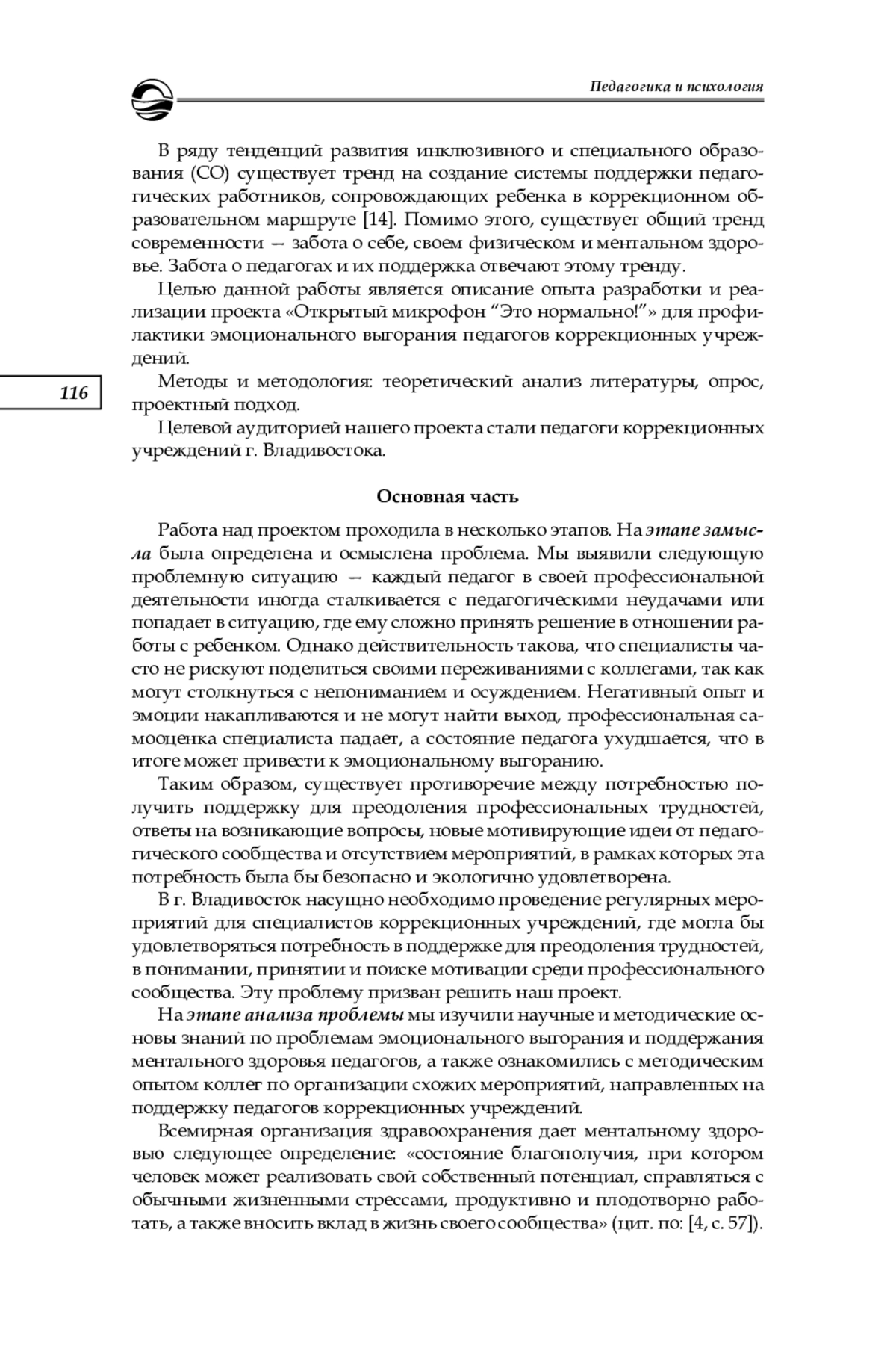 Описан опыт создания и реализации проекта для педагогов специального образования «Открытый микрофон “Это нормально!”». Рассматриваются вопросы ментального здоровья и эмоционального выгорания педагогов специального образования, а также методы, приемы, концепции и рекомендации для регуляции эмоционального выгорания. Предложен вариант решения проблемы поддержания ментального здоровья специальных педагогов посредством организации мероприятия «Открытый микрофон “Это нормально!”». Охарактеризованы составные части и аспекты проектной деятельности, замысел, миссия, цель и задачи проекта, критерии оценки результата, возможные риски и способы их устранения, непосредственный план мероприятия и полный список необходимых для этого ресурсов. Описаны результаты проекта и его достоинства для дальнейшего его использования и реорганизации в других образовательных учреждениях