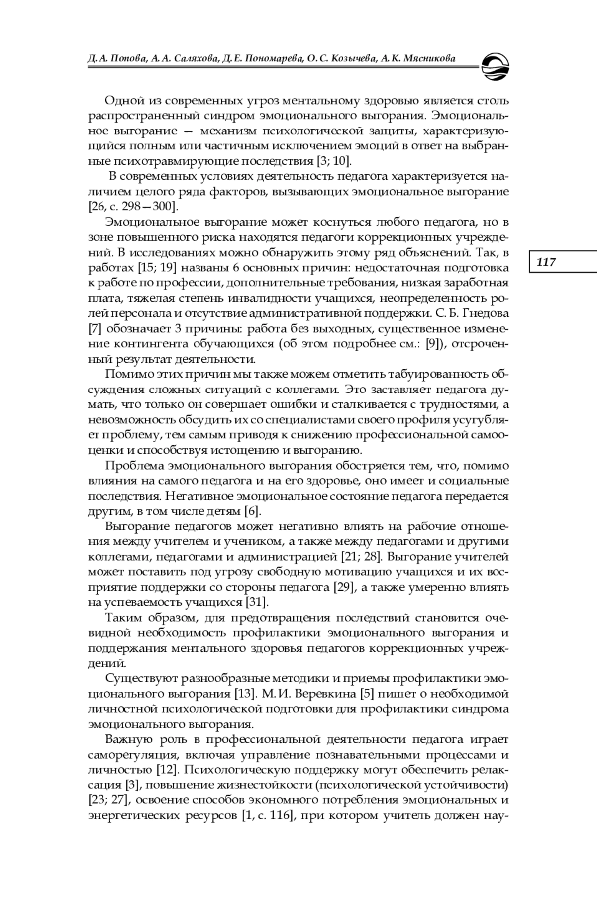 6. Гайфуллина Л. К., Шкрылева И. В. Преодоление эмоционального выгорания у педагогов-дефектологов, работающих с обучающимися с ОВЗ (интеллектуальными нарушениями) // Конференциум АСОУ: сб. науч. труд. и материалов науч.-практ. конф. 2016. № 4. С. 2116-2126. EDN: ZDDMCT