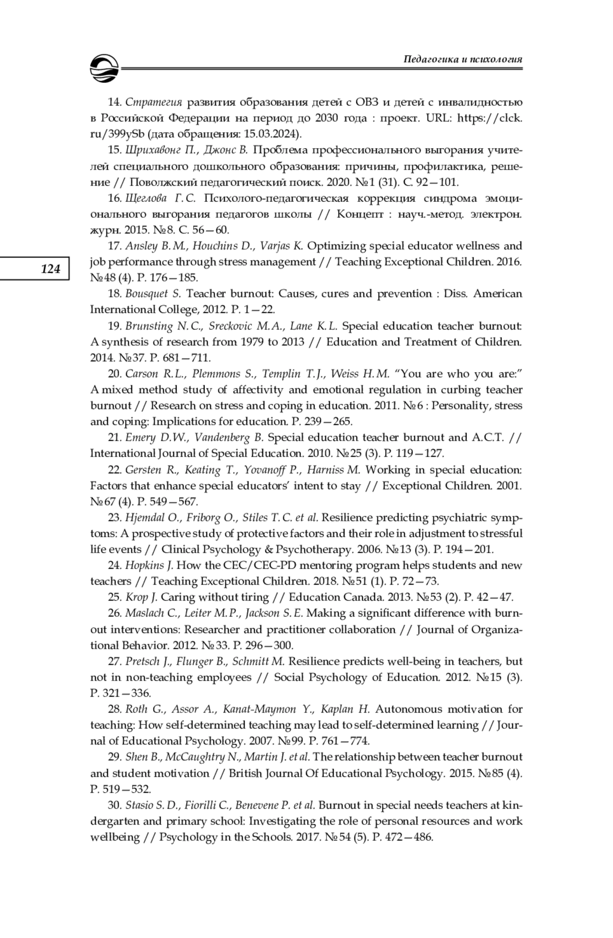 21. Emery D. W., Vandenberg B. Special education teacher burnout and A.C.T. // International Journal of Special Education. 2010. № 25 (3). P. 119-127.