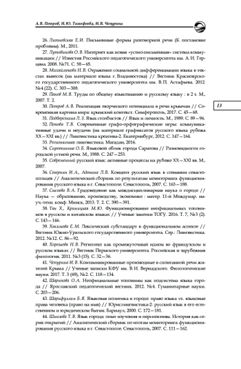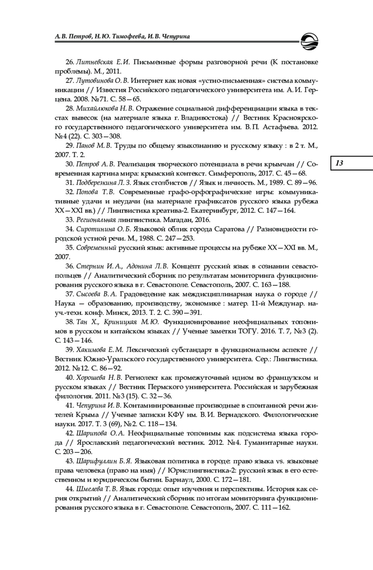 44. Шмелева Т. В. Язык города: опыт изучения и перспективы. История как серия открытий // Аналитический сборник по итогам мониторинга функционирования русского языка в г. Севастополе. Севастополь, 2007. С. 111-162.