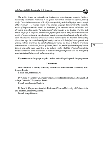 Предпринята попытка обзора методологических тенденций изучения языка города. При этом обосновывается рациональность раздельного изучения письменного и устного вариантов городской речи. Подчеркивается активность лингвистических исследований городского пространства и выделяется понятие региолекта — регионального варианта национального языка. Анализ научных результатов лингвоурбанистики выявляет доминантное положение ономастического направления и недостаточность исследований городской речи. Приводятся аргументы нетождественности функционирования письменной и устной форм речи как с лингвистических, так и с семиотических и психологических позиций. Отмечаются факты деструктивных результатов механического перенесения приемов устной речи в городскую эпиграфику, описываются отличия словообразовательных процессов в письменной и устной речи. В качестве особенностей письменной коммуникации перечисляются визуальность письменного знака, возможность гибридного словообразования с помощью иных символьно-графических систем, а также активность языковых норм. Отличительной особенностью устной формы признается возможность экспликации смысла посредством невербальных знаков. Соблюдение принципа несмешанного изучения живой речи и городской письменности должно обеспечить, по мнению авторов, бóльшую достоверность научных результатов в сфере современного градоведения