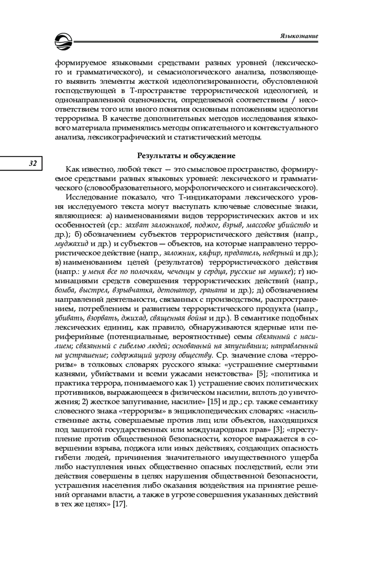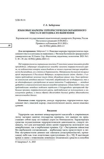 Под террористически окрашенным текстом (Т-текстом) можно понимать речевое произведение, содержащее специфические языковые элементы террористической угрозы, по особенностям которых можно выявить не только социально опасную направленность высказывания, но и степень ее выраженности. Материалом для анализа послужил архив запрещенного в Российской Федерации экстремистского сайта «Kavkaz», в котором представлено несколько тысяч веток обсуждения разных тем. Была предложена комплексная методика анализа Т-текстов, направленная как на обнаружение, так и на идентификацию и распределение на шкале опасности Т-информации, — методика уровневого и семасиологического анализа языкового материала. Сделан вывод о том, что представленная методика позволяет определить в дискурсивном пространстве вербальные признаки террористической угрозы, представленные на эксплицитном и имплицитном уровнях, и таким образом обеспечивает высокий уровень объективности анализа языковых данных
