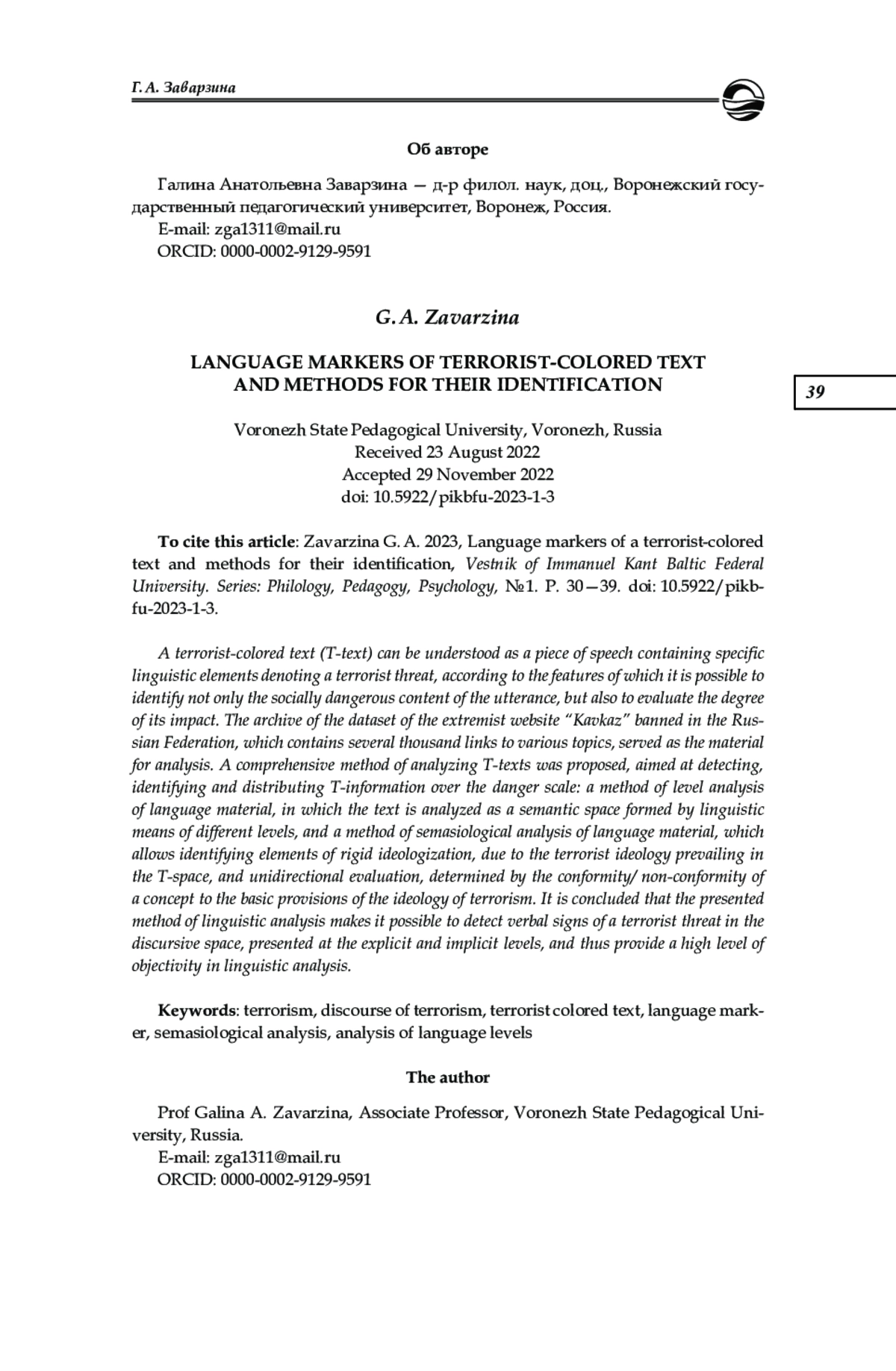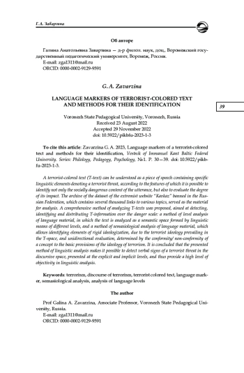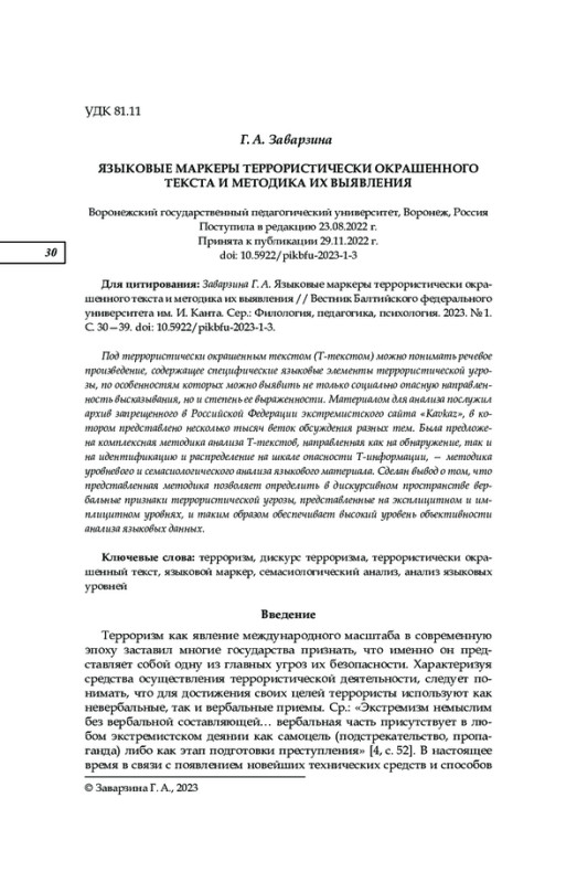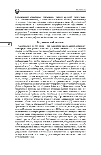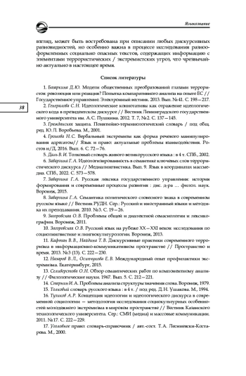 6. Заварзина Г. А. Идеологизированность в семантике ключевых слов террористического дискурса // Медиалингвистика. Вып. 9. Язык в координатах массмедиа. СПб., 2022. С. 573-578.