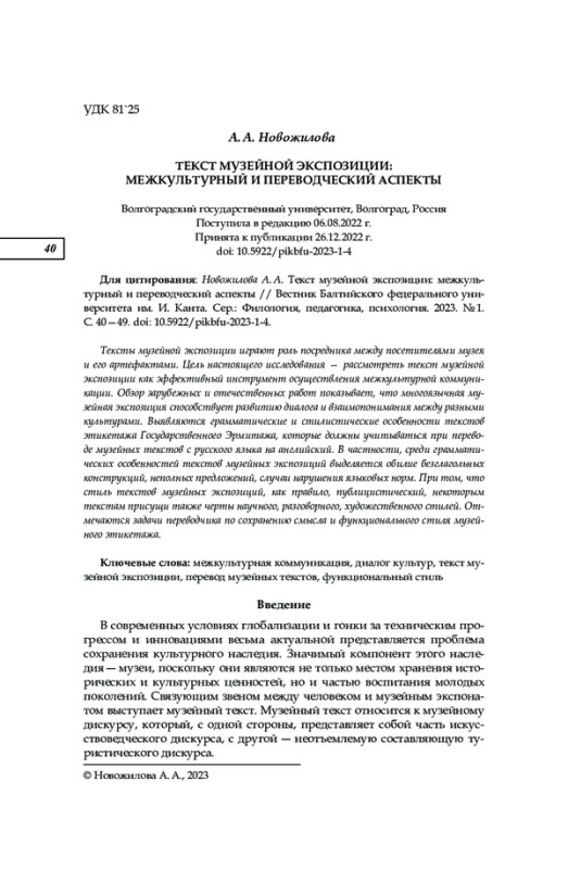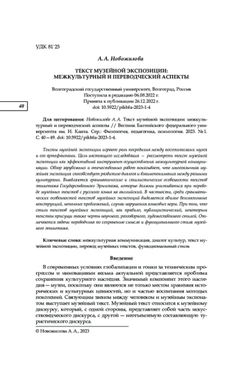 Тексты музейной экспозиции играют роль посредника между посетителями музея и его артефактами. Цель настоящего исследования — рассмотреть текст музейной экспозиции как эффективный инструмент осуществления межкультурной коммуникации. Обзор зарубежных и отечественных работ показывает, что многоязычная музейная экспозиция способствует развитию диалога и взаимопонимания между разными культурами. Выявляются грамматические и стилистические особенности текстов этикетажа Государственного Эрмитажа, которые должны учитываться при переводе музейных текстов с русского языка на английский. В частности, среди грамматических особенностей текстов музейных экспозиций выделяется обилие безглагольных конструкций, неполных предложений, случаи нарушения языковых норм. При том, что стиль текстов музейных экспозиций, как правило, публицистический, некоторым текстам присущи также черты научного, разговорного, художественного стилей. Отмечаются задачи переводчика по сохранению смысла и функционального стиля музейного этикетажа