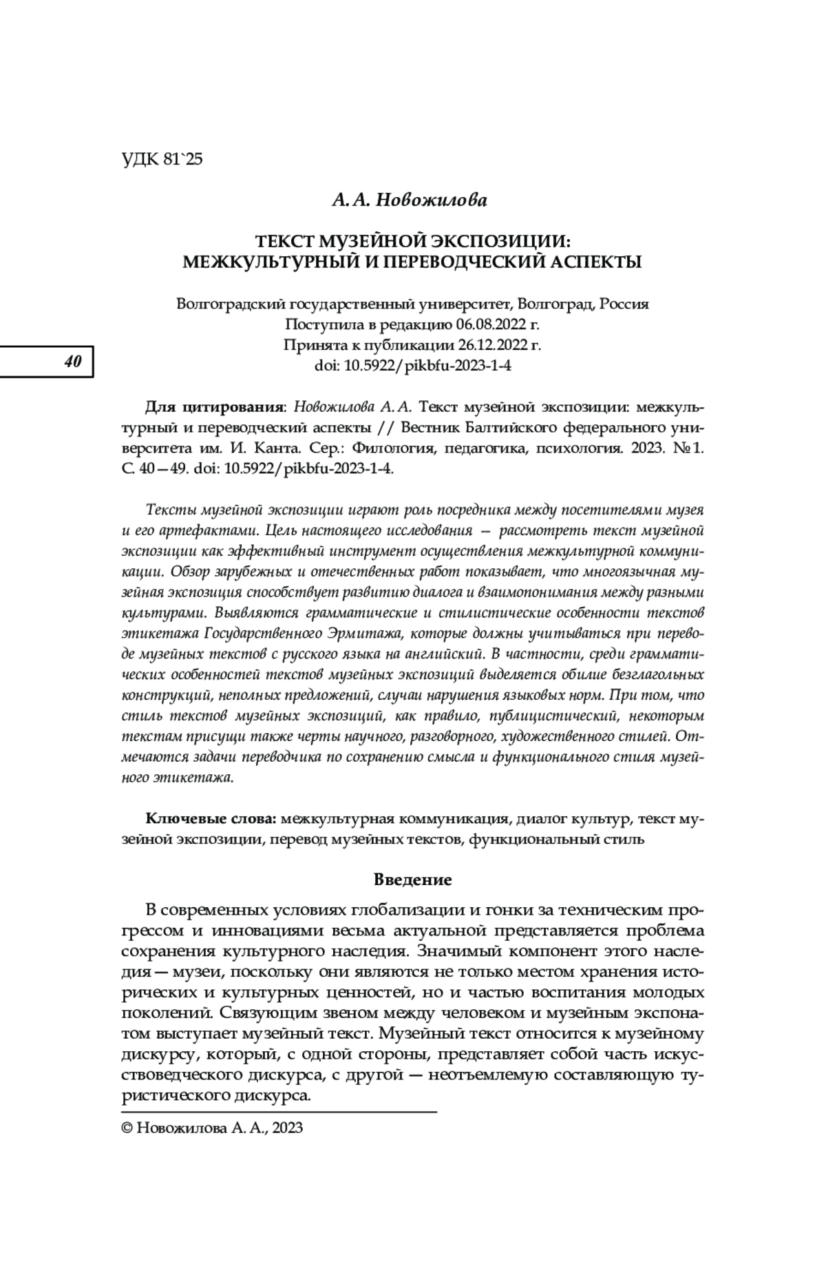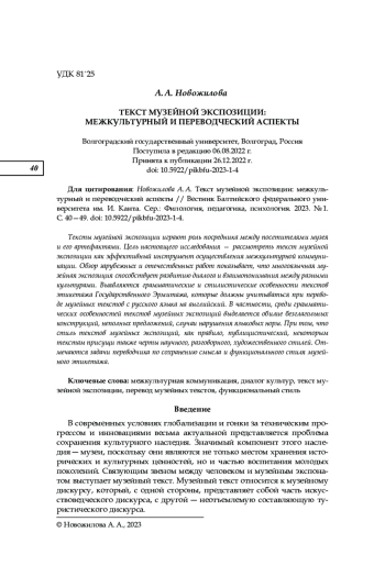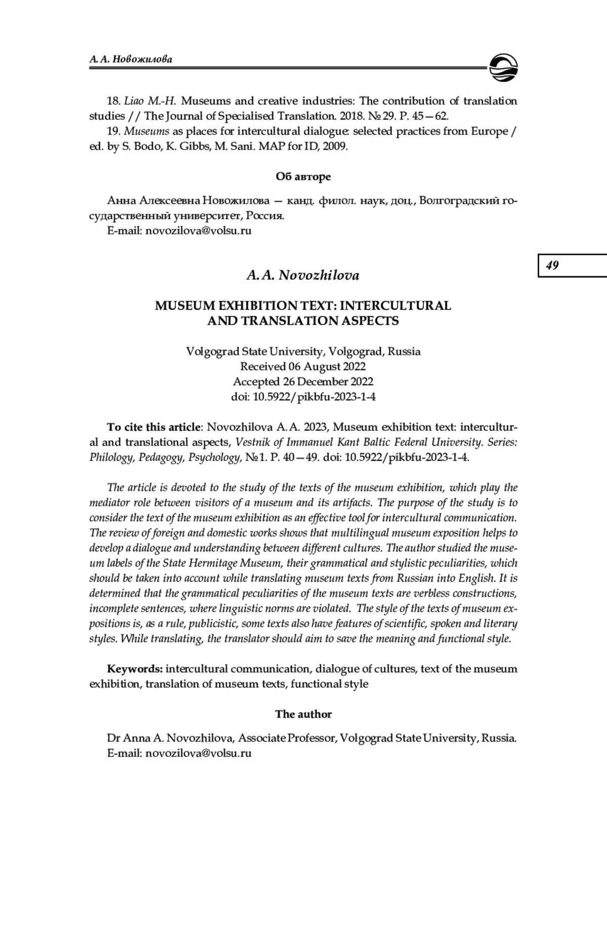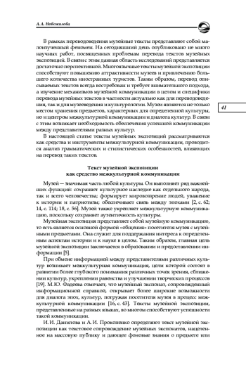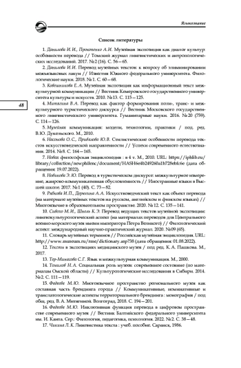 1. Данилова И. И., Прокопенко А. И. Музейная экспозиция как диалог культур: особенности перевода // Томский журнал лингвистических и антропологических исследований. 2017. № 2 (16). С. 56-65. EDN: ZEHILJ