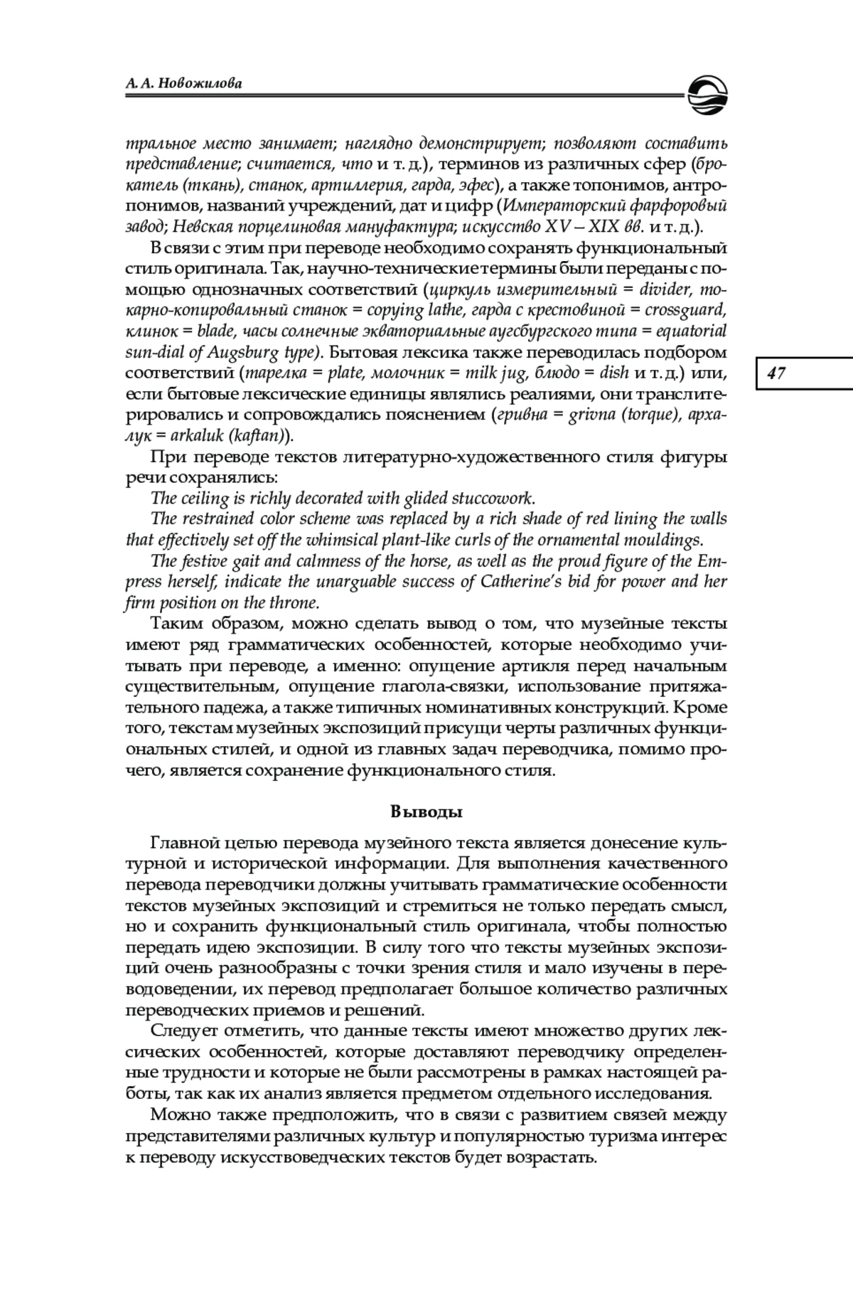 6. Насонова О. С., Привалова Ю. В. Стилистические особенности перевода текстов искусствоведческой направленности // Успехи современного естествознания. 2014. № 8. С. 164-165. EDN: SEJRSN