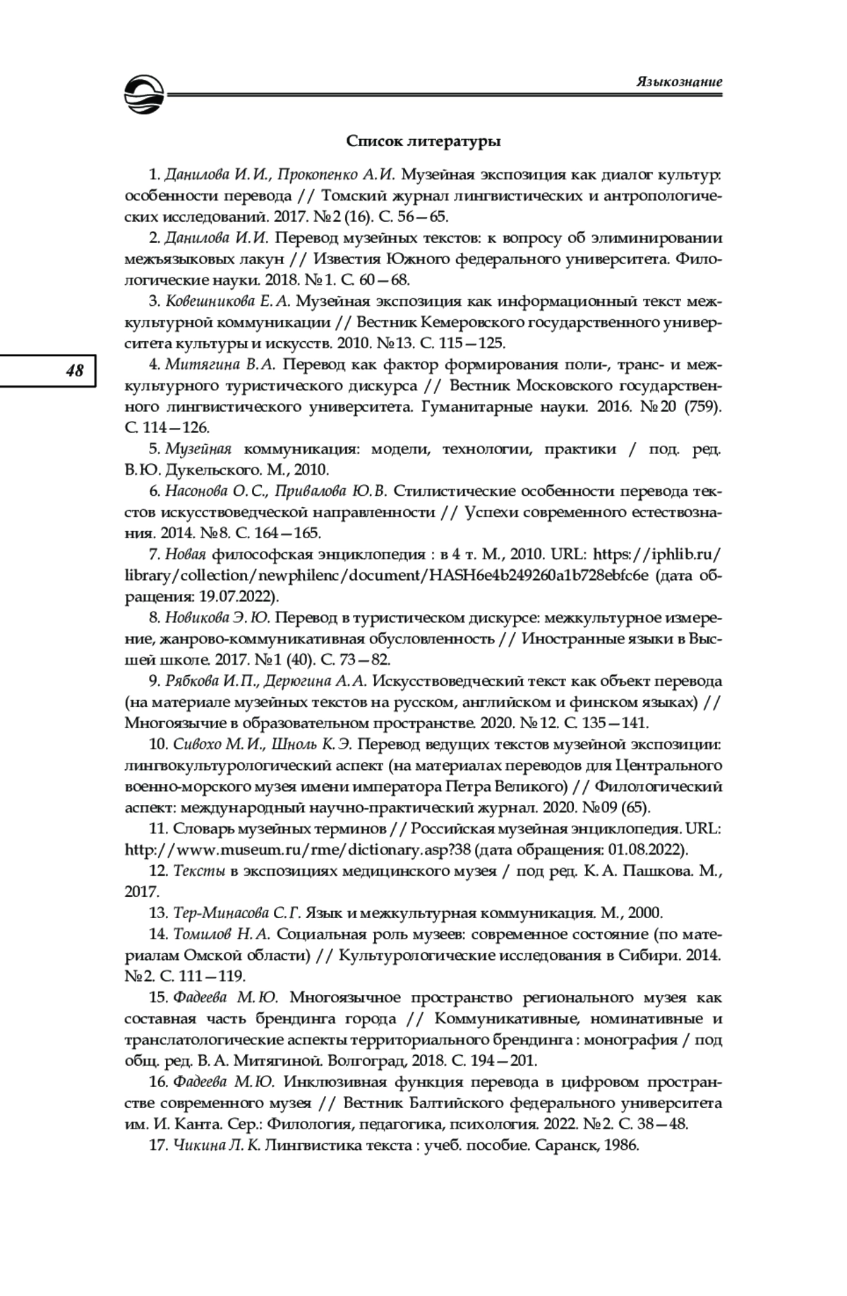 2. Данилова И. И. Перевод музейных текстов: к вопросу об элиминировании межъязыковых лакун // Известия Южного федерального университета. Филологические науки. 2018. № 1. С. 60-68. EDN: YVDMGR