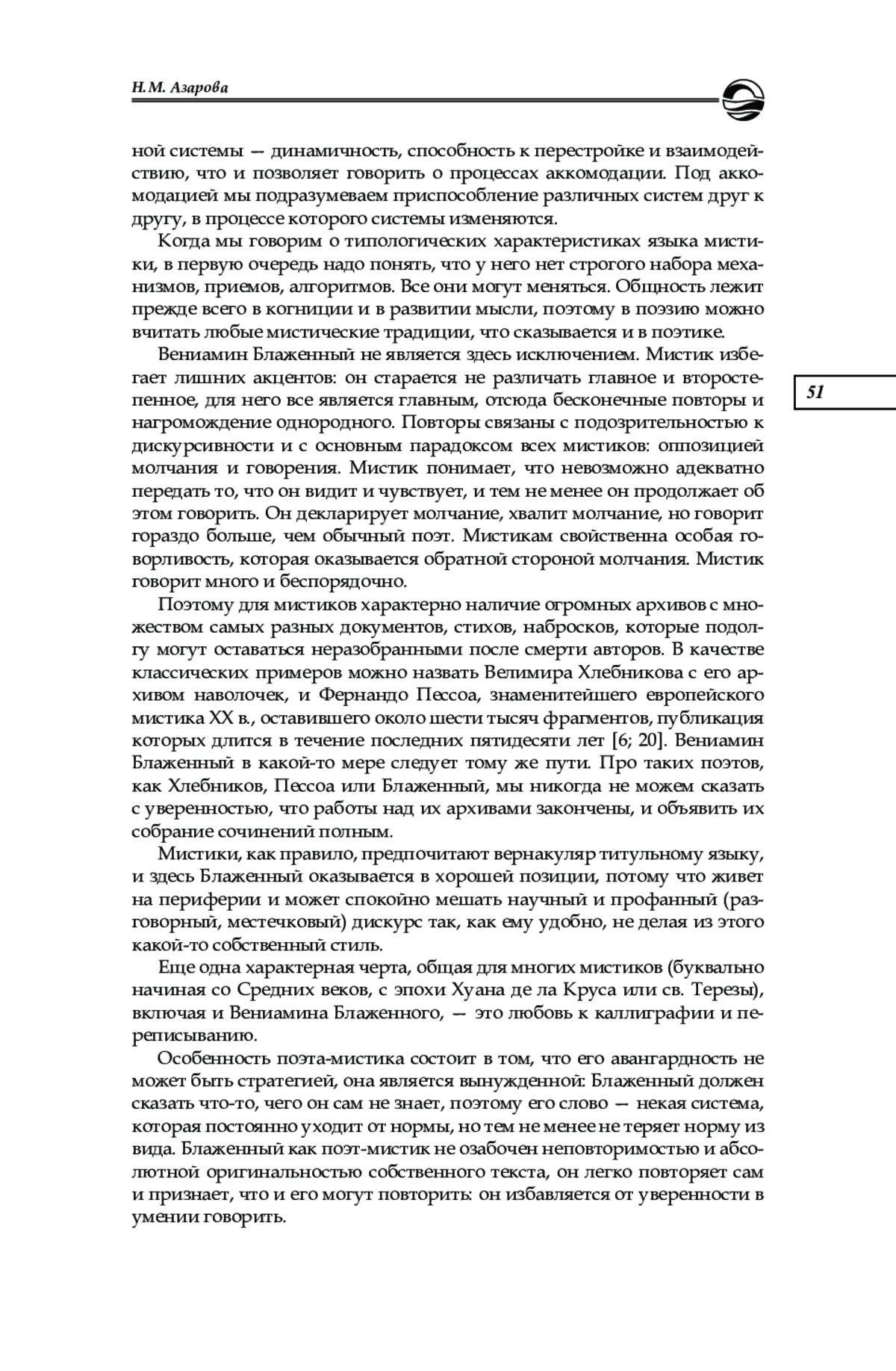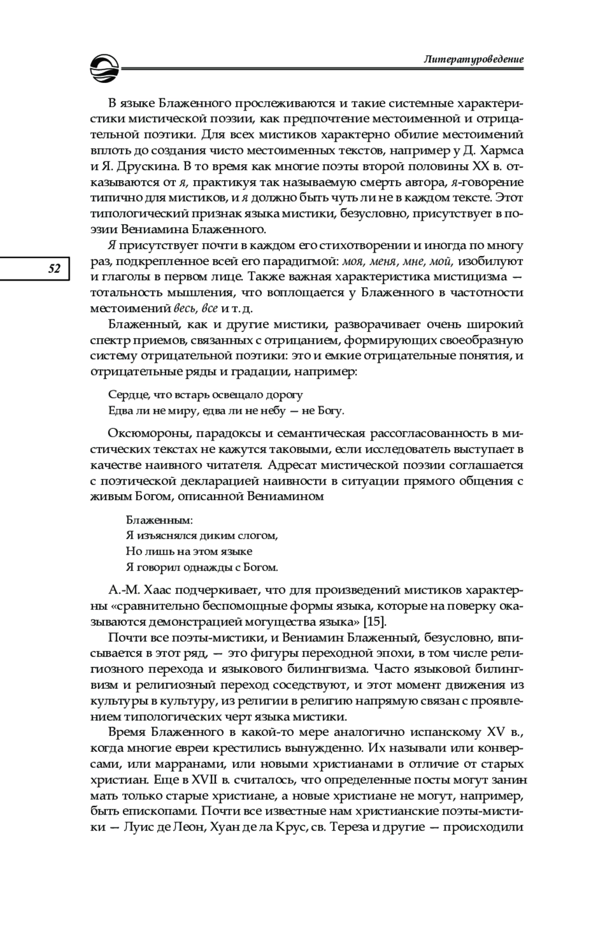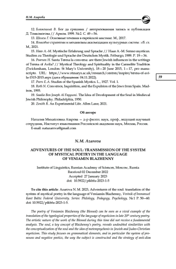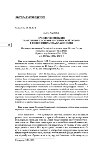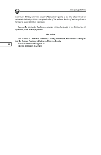 Вениамин Блаженный ― поэт ХХ столетия, «открытый» критикой и литературоведением лишь тридцать лет назад. Художественная природа творчества Блаженного за это время не получила фундаментального описания. Общим местом многих работ о поэте стала констатация своеобразных религиозных основ его творчества, синтезирующих иудейское и христианское начала. В настоящей работе поэзия Вениамина Блаженного рассматривается в контексте языка мистиков как культурной системы — в качестве яркого примера трансляции типологических свойств языка мистики в поэзии конца ХХ в., что реализуется в грамматической составляющей, в частности в системе местоименной и отрицательной поэтики, в способе построения субъекта и в стратегии антидискурсивности. Ключевое слово и концепт поэзии Блаженного душа обнаруживает несомненное сходство с концептуализацией души и идеей метемпсихоза в еврейской и еврейско-христианской мистике
