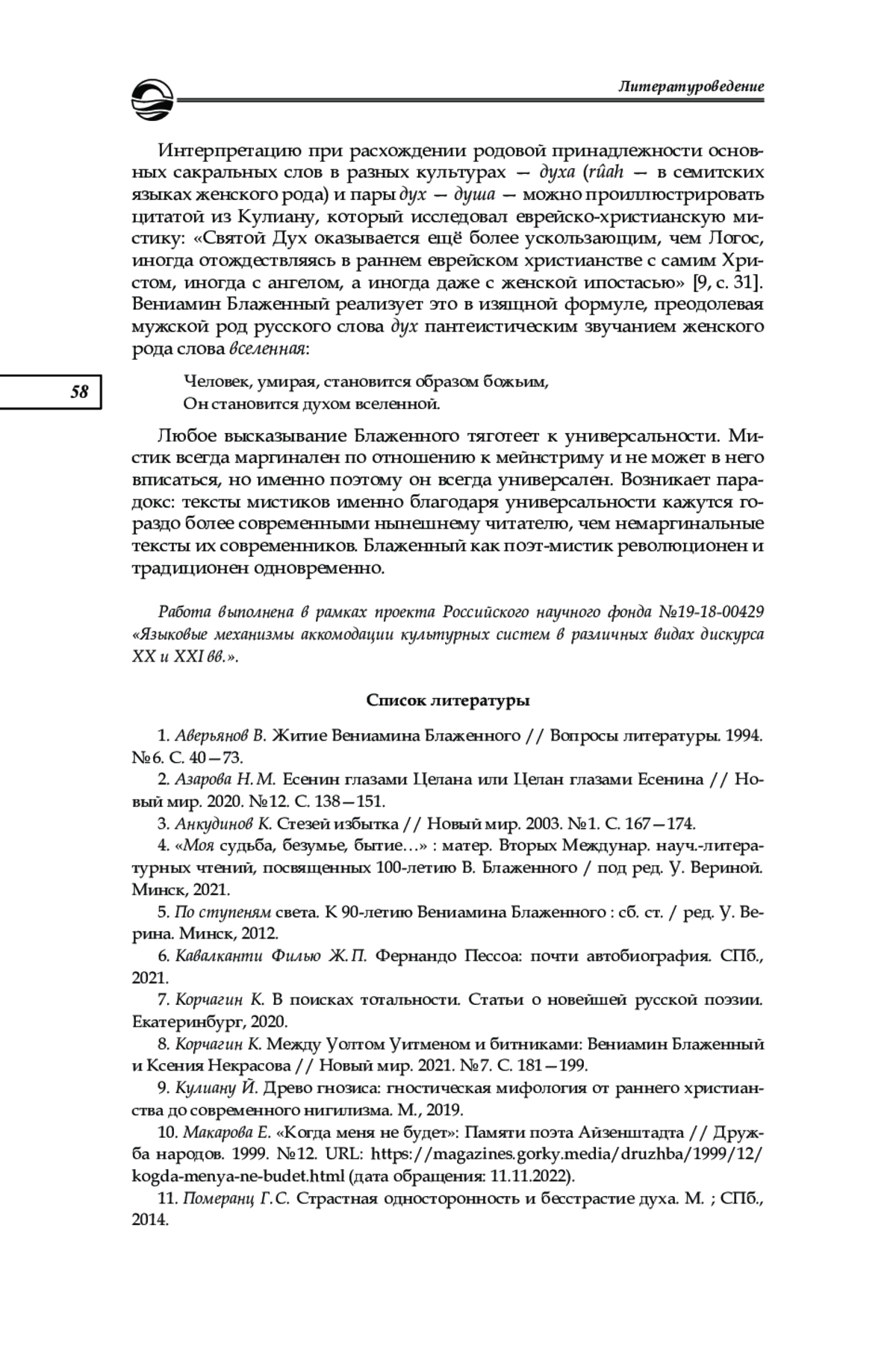 12. Блаженный В. Бог да грешник / авторизованная запись и публикация Д. Тонконогова // Арион. 1999. № 2. C. 49-56.
