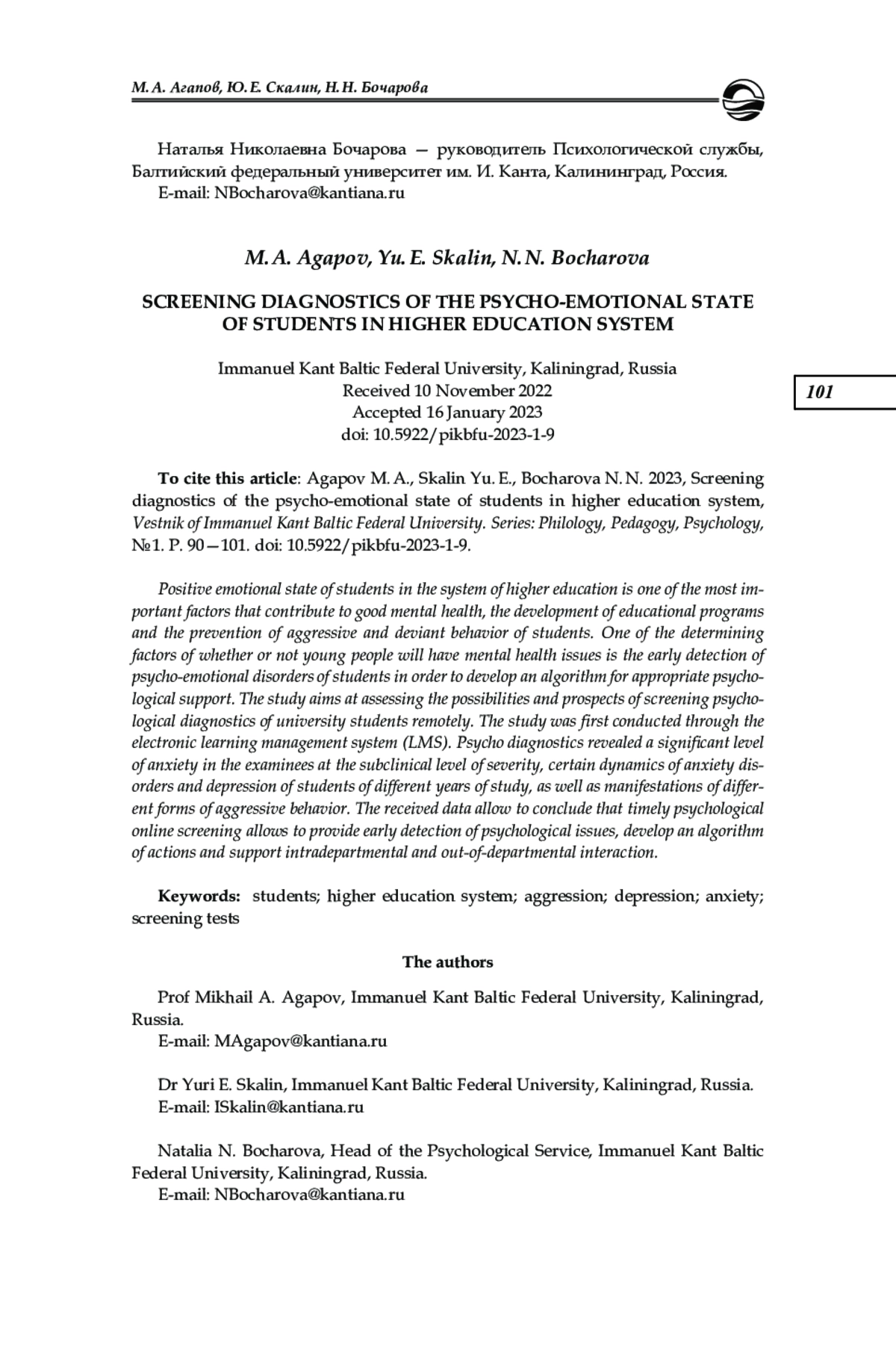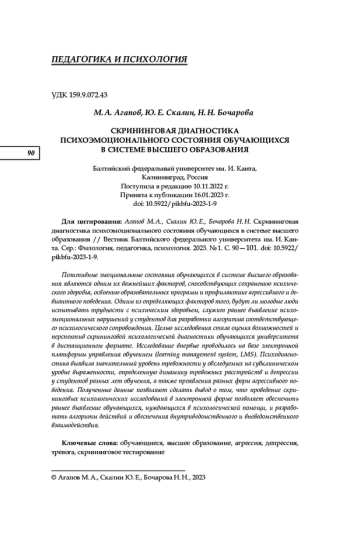 Позитивные эмоциональные состояния обучающихся в системе высшего образования являются одним их важнейших факторов, способствующих сохранению психического здоровья, освоению образовательных программ и профилактике агрессивного и девиантного поведения. Одним из определяющих факторов того, будут ли молодые люди испытывать трудности с психическим здоровьем, служит раннее выявление психоэмоциональных нарушений у студентов для разработки алгоритма соответствующего психологического сопровождения. Целью исследования стала оценка возможностей и перспектив скрининговой психологической диагностики обучающихся университета в дистанционном формате. Исследование впервые проводилось на базе электронной платформы управления обучением (learning management system, LMS). Психодиагностика выявила значительный уровень тревожности у обследуемых на субклиническом уровне выраженности, определенную динамику тревожных расстройств и депрессии у студентов разных лет обучения, а также проявления разных форм агрессивного поведения. Полученные данные позволяют сделать вывод о том, что проведение скрининговых психологических исследований в электронной форме позволяет обеспечить раннее выявление обучающихся, нуждающихся в психологической помощи, и разработать алгоритм действий и обеспечения внутриведомственного и вневедомственного взаимодействия