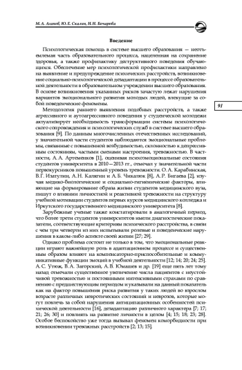 Психологическая помощь в системе высшего образования — неотъемлемая часть образовательного процесса, нацеленная на сохранение здоровья, а также профилактику деструктивного поведения обучающихся. Обеспечение мер психологической профилактики направлено на выявление и предупреждение психических расстройств, возникновение социально-психологической дезадаптации в процессе образовательной деятельности в образовательном учреждении высшего образования. В основе возникновения указанных рисков зачастую лежат нарушения вариантов эмоционального развития молодых людей, влекущие за собой поведенческие феномены.