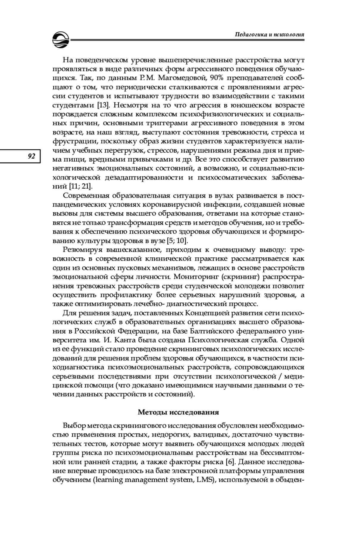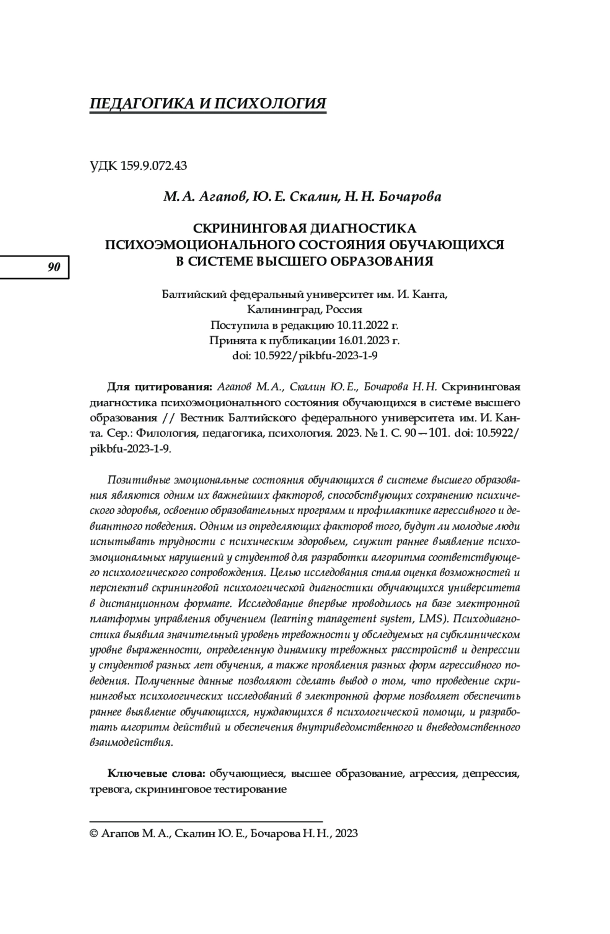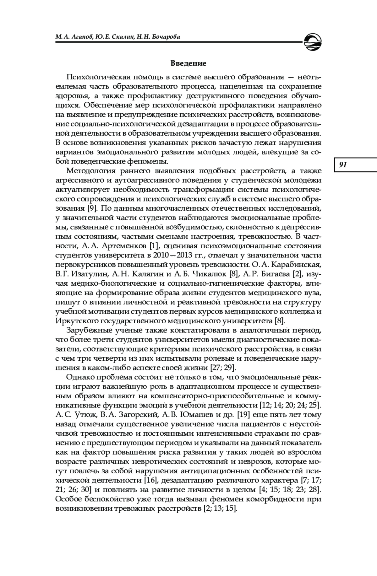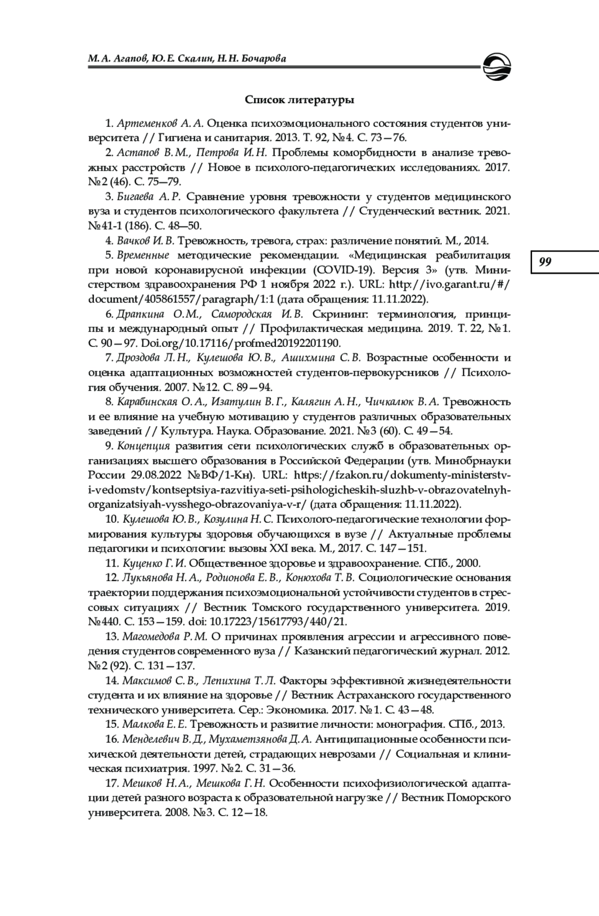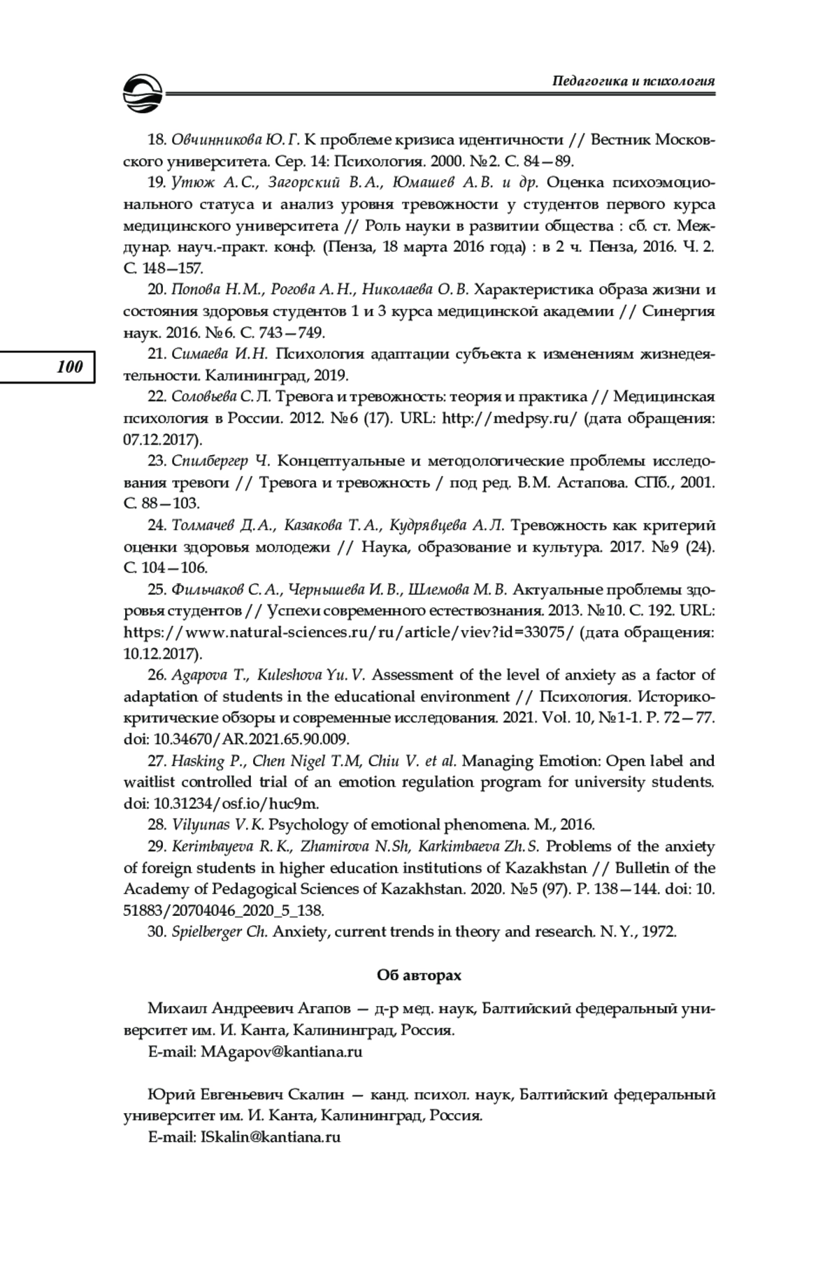 26. Agapova T., Kuleshova Yu. V. Assessment of the level of anxiety as a factor of adaptation of students in the educational environment // Психология. Историко-критические обзоры и современные исследования. 2021. Vol. 10, № 1-1. P. 72- 77. DOI: 10.34670/AR.2021.65.90.009 EDN: TGTTLA