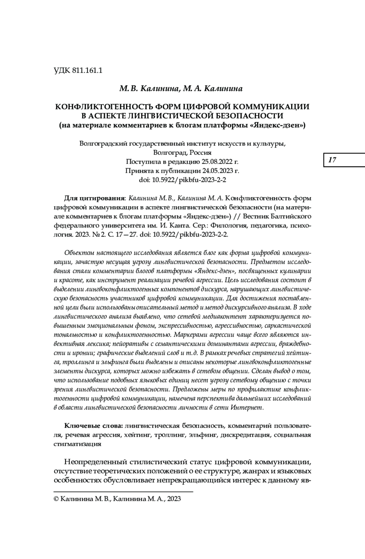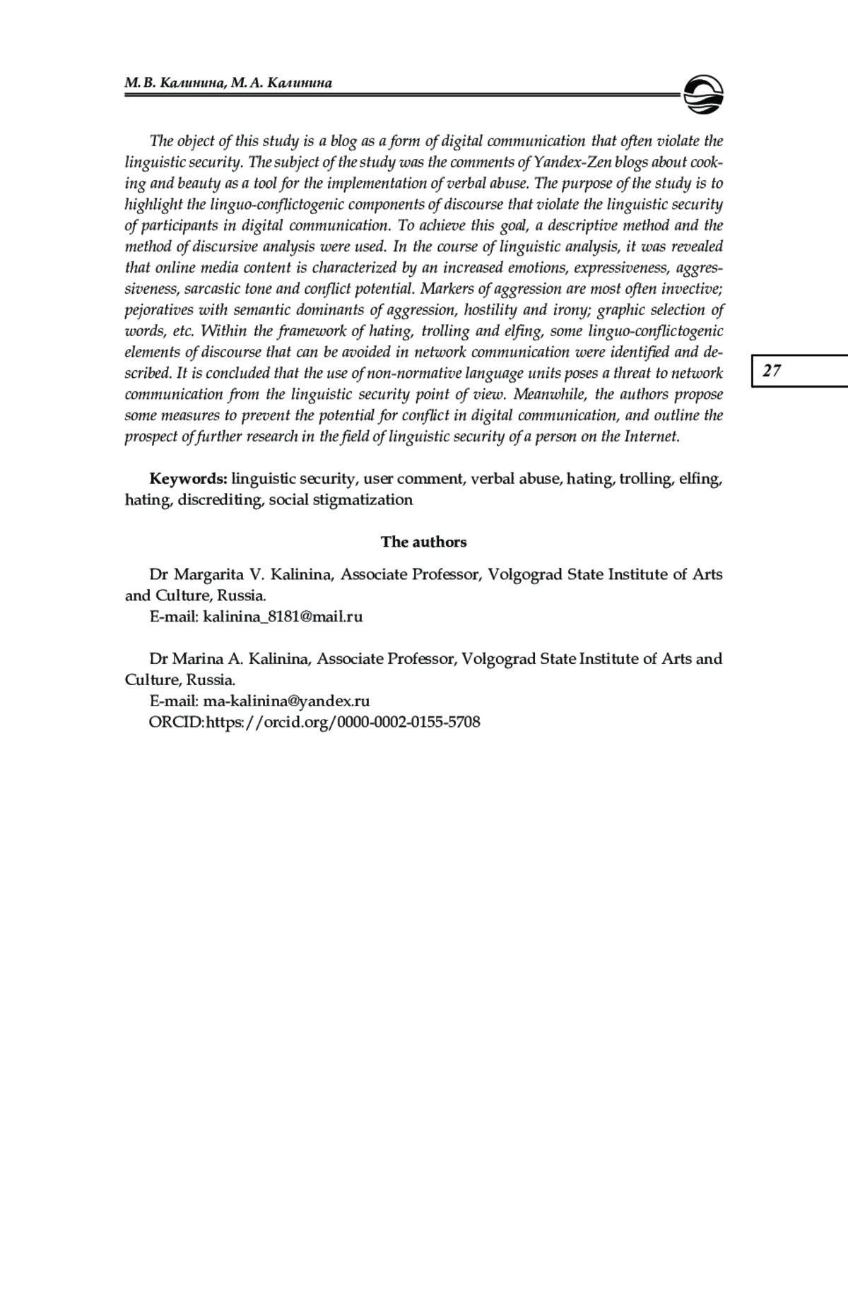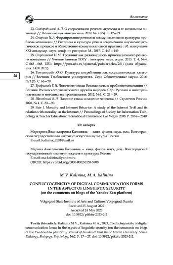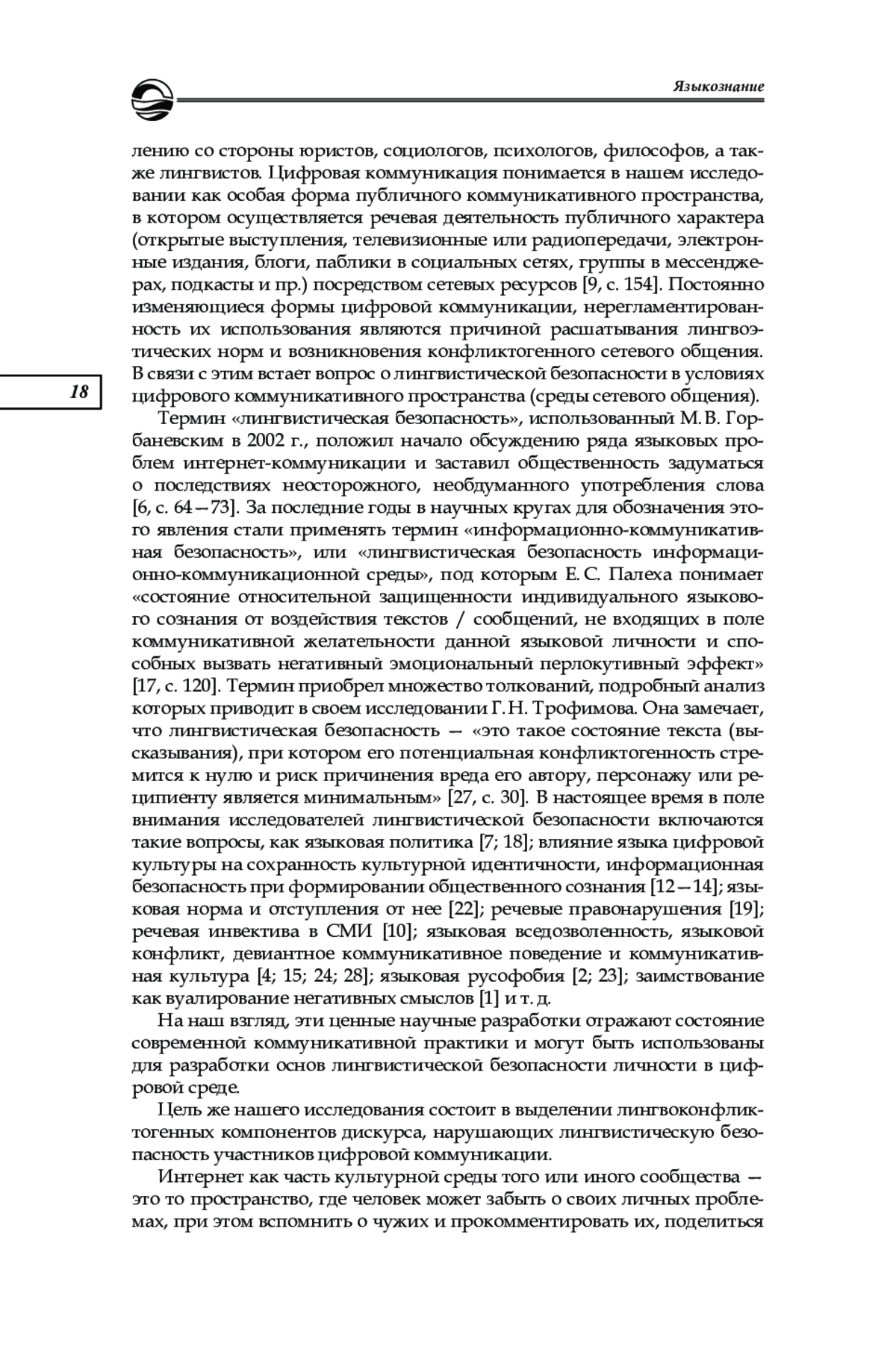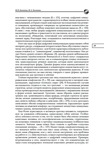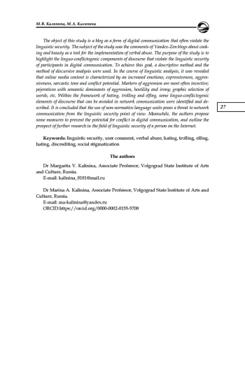 Объектом настоящего исследования является блог как форма цифровой коммуникации, зачастую несущая угрозу лингвистической безопасности. Предметом исследования стали комментарии блогов платформы «Яндекс-дзен», посвященных кулинарии и красоте, как инструмент реализации речевой агрессии. Цель исследования состоит в выделении лингвоконфликтогенных компонентов дискурса, нарушающих лингвистическую безопасность участников цифровой коммуникации. Для достижения поставленной цели были использованы описательный метод и метод дискурсивного анализа. В ходе лингвистического анализа выявлено, что сетевой медиаконтент характеризуется повышенным эмоциональным фоном, экспрессивностью, агрессивностью, саркастической тональностью и конфликтогенностью. Маркерами агрессии чаще всего являются инвективная лексика; пейоративы с семантическими доминантами агрессии, враждебности и иронии; графические выделений слов и т. д. В рамках речевых стратегий хейтинга, троллинга и эльфинга были выделены и описаны некоторые лингвоконфликтогенные элементы дискурса, которых можно избежать в сетевом общении. Сделан вывод о том, что использование подобных языковых единиц несет угрозу сетевому общению с точки зрения лингвистической безопасности. Предложены меры по профилактике конфликтогенности цифровой коммуникации, намечена перспектива дальнейших исследований в области лингвистической безопасности личности в сети Интернет