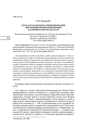 Рассматриваются способы согласования исходных восточнопрусских и новых советских ойконимов в процессе послевоенного переименования населенных пунктов Калининградской области. В результате сопоставительного фонетического и семантического анализа соответствующих названий выяснилось, что среди использовавшихся способов согласования названий лидируют одинаковая тематическая соотнесенность (с преобладанием отсылок к флоре, фауне и водоемам местности) и идеологическая антонимия, проявляющаяся, как правило, в косвенной форме. Несколько реже инициаторами переименований применялись для согласования ойконимов перевод (обычно частичный), семантическая антонимия и заимствование. Отмечена незначительная представленность согласованных переименований в исследованном материале (не более 11 % всех региональных реноминаций), сделан вывод об их преимущественно случайном характере