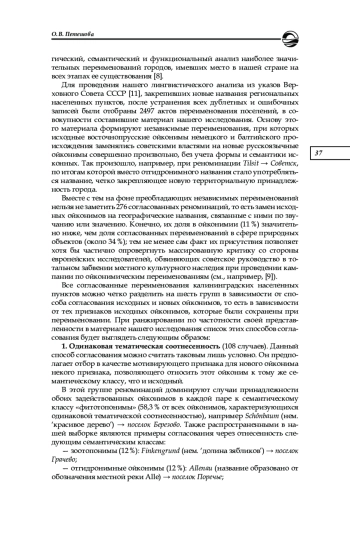 Как известно, система ойконимов Калининградской области была сформирована во второй половине ХХ в. в результате массового переименования населенных пунктов бывшей Северо-Восточной Пруссии, территории которой вошли в состав Советского Союза после Второй мировой войны. Говоря о переименованиях в этом контексте, имеют в виду процесс замены одного имени географического объекта на другое (новое или исконное) [3, с. 135], осуществленный путем принятия некоторым органом власти специального нормативного акта. Чаще всего топонимические переименования рассматриваются в современной науке с исторических позиций [2; 5], значительно реже — с позиций экономики [6], однако определенное внимание уделяют реноминациям и лингвисты.