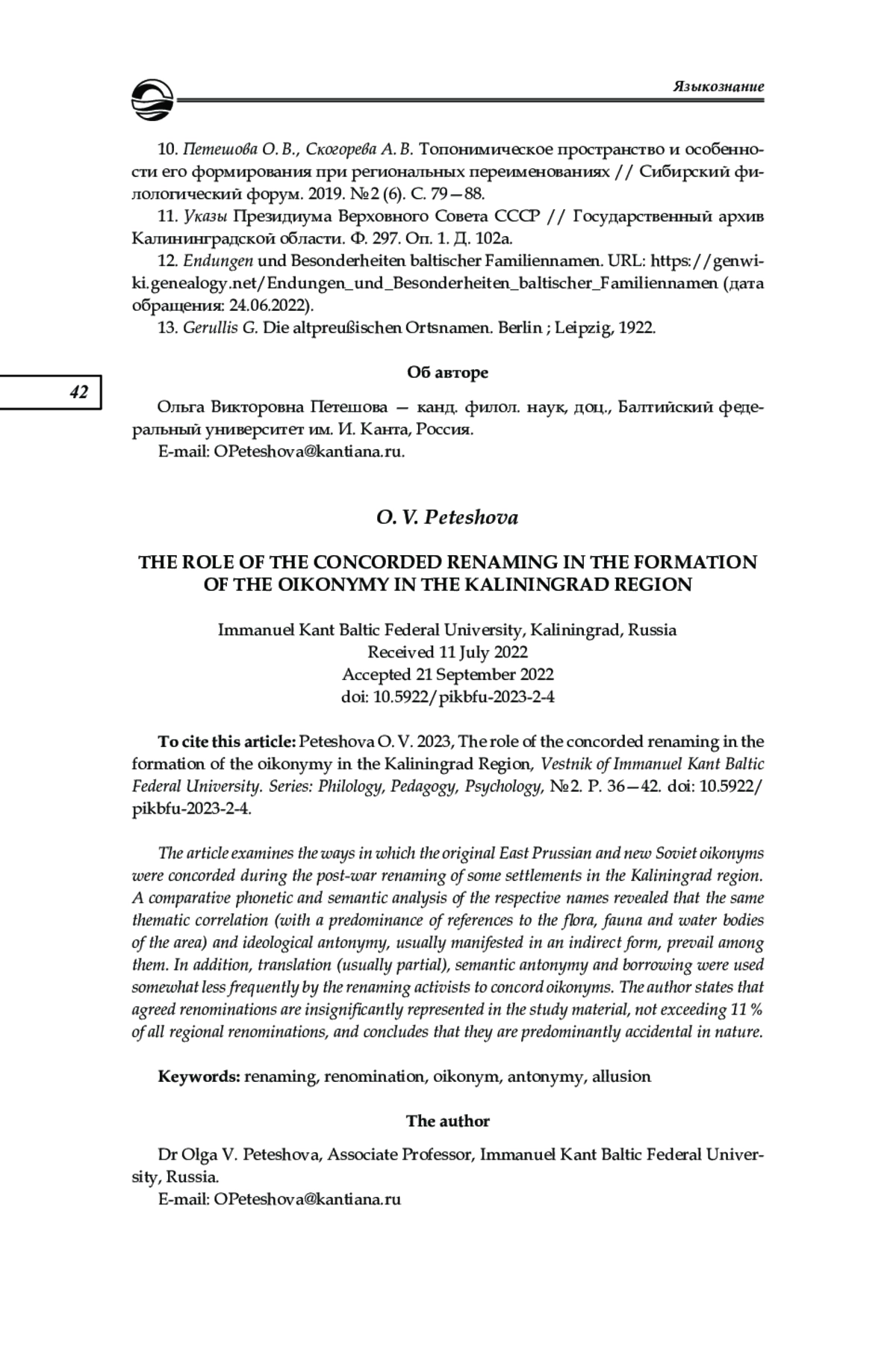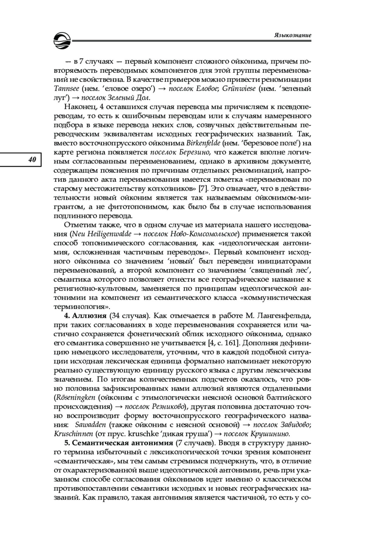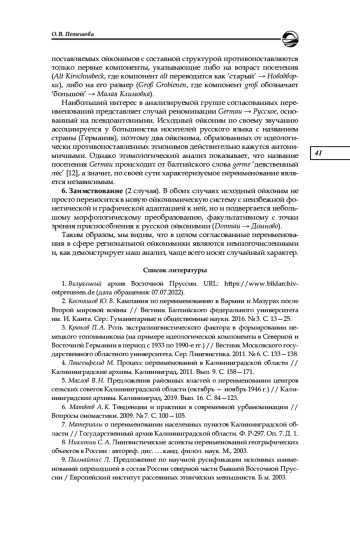 4. Лангенфельд М. Процесс переименований в Калининградской области // Калининградские архивы. Калининград, 2011. Вып. 9. С. 158-171. EDN: RSHPXJ