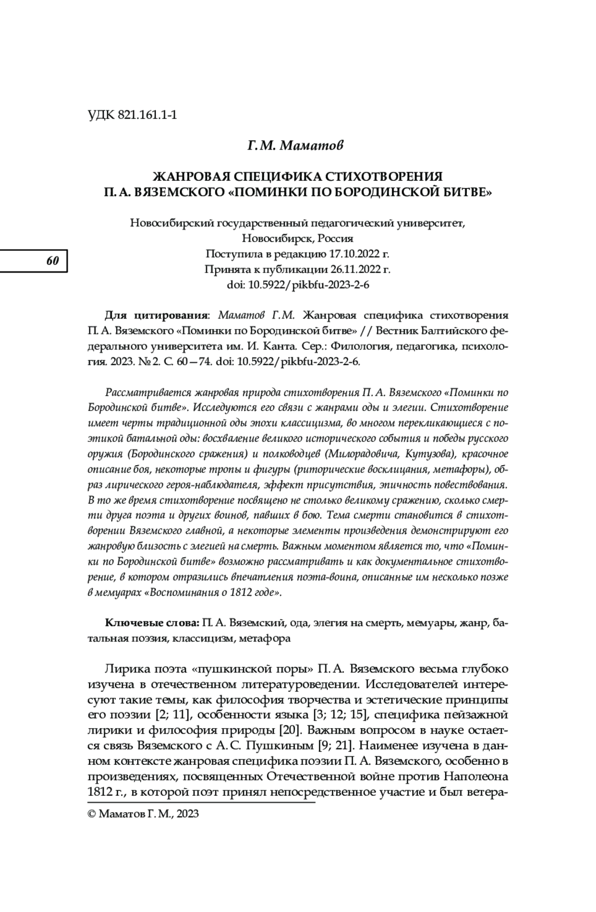 11. Лазарев В. В. Поэзия П. А. Вяземского на пути к постижению непознаваемого // Философия и культура. 2017. № 6. С. 90-109. EDN: YUMWFB
