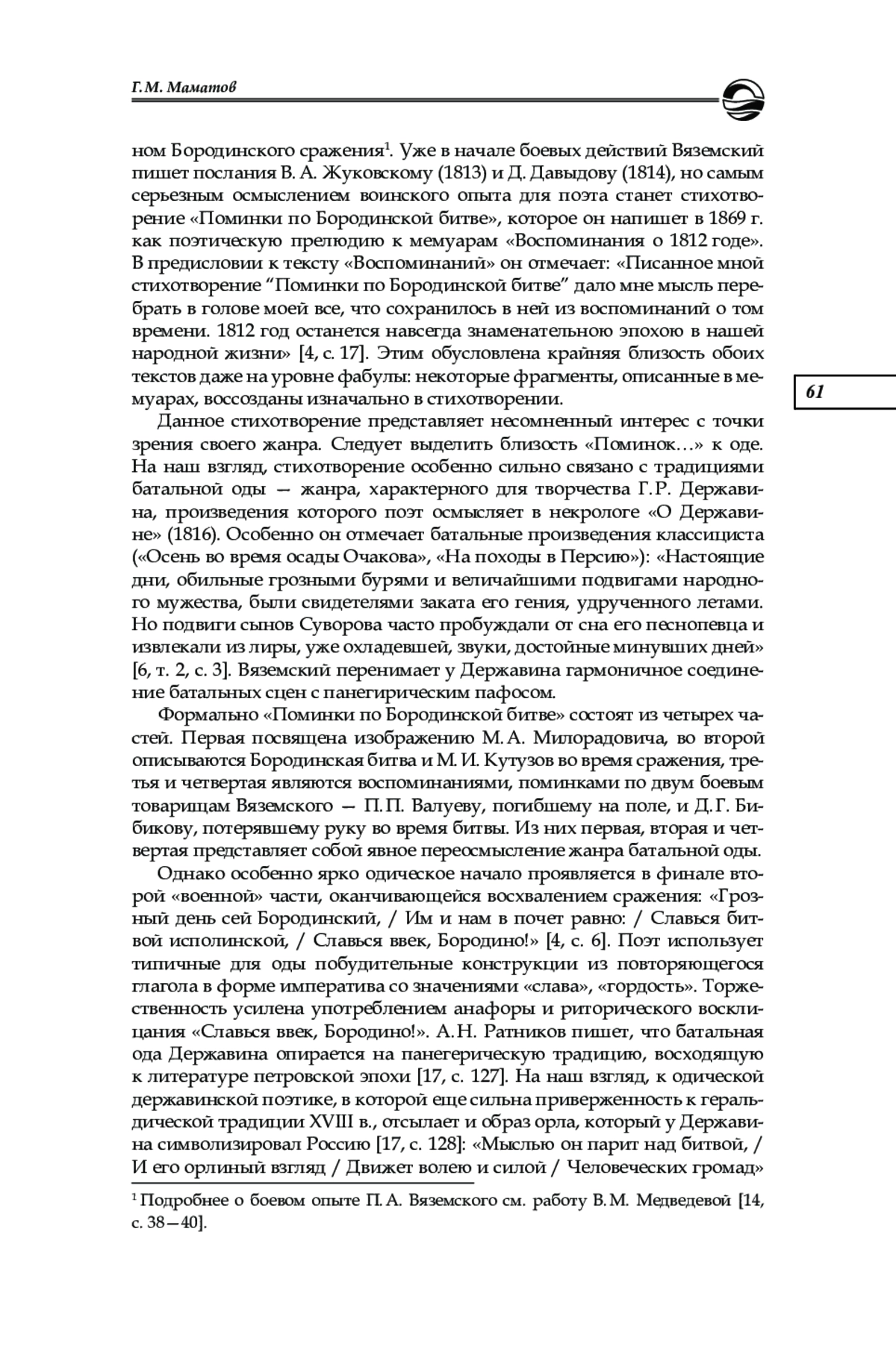 14. Медведева В. М. Подвиг Петра Вяземского в Отечественной войне 1812 г. // Проблемы эффективного использования научного потенциала общества: материалы междунар. науч.-практ. конф. Уфа. 2017. С. 38-40. EDN: ZXTGRJ