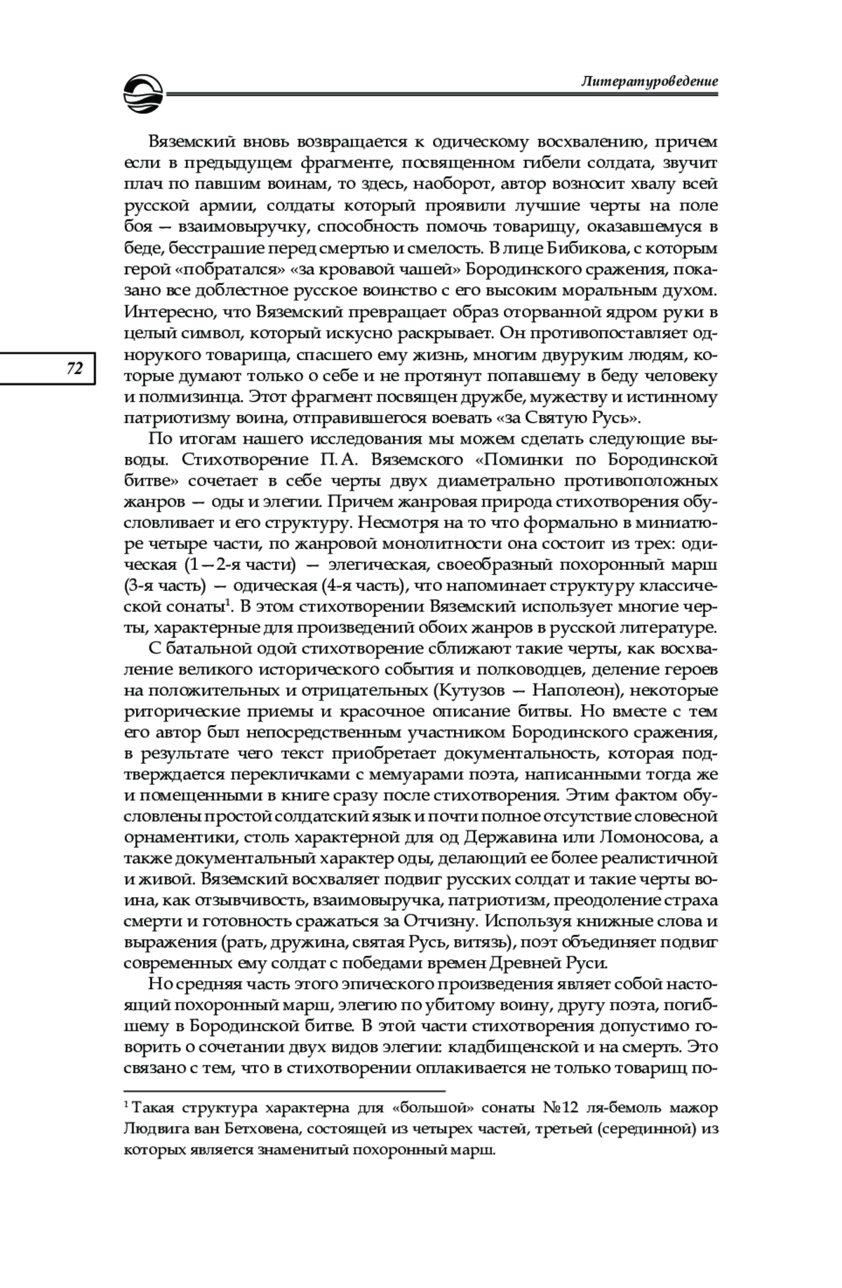 Лирика поэта «пушкинской поры» П. А. Вяземского весьма глубоко изучена в отечественном литературоведении. Исследователей интересуют такие темы, как философия творчества и эстетические принципы его поэзии [2; 11], особенности языка [3; 12; 15], специфика пейзажной лирики и философия природы [20]. Важным вопросом в науке остается связь Вяземского с А. С. Пушкиным [9; 21]. Наименее изучена в данном контексте жанровая специфика поэзии П. А. Вяземского, особенно в произведениях, посвященных Отечественной войне против Наполеона 1812 г.