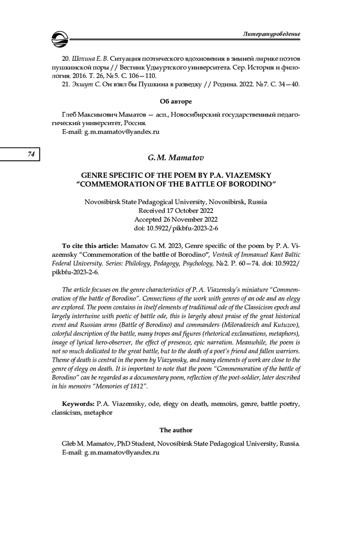 20. Шохина Е. В. Ситуация поэтического вдохновения в зимней лирике поэтов пушкинской поры // Вестник Удмуртского университета. Сер. История и филология. 2016. Т. 26, № 5. С. 106-110. EDN: WZQTIT