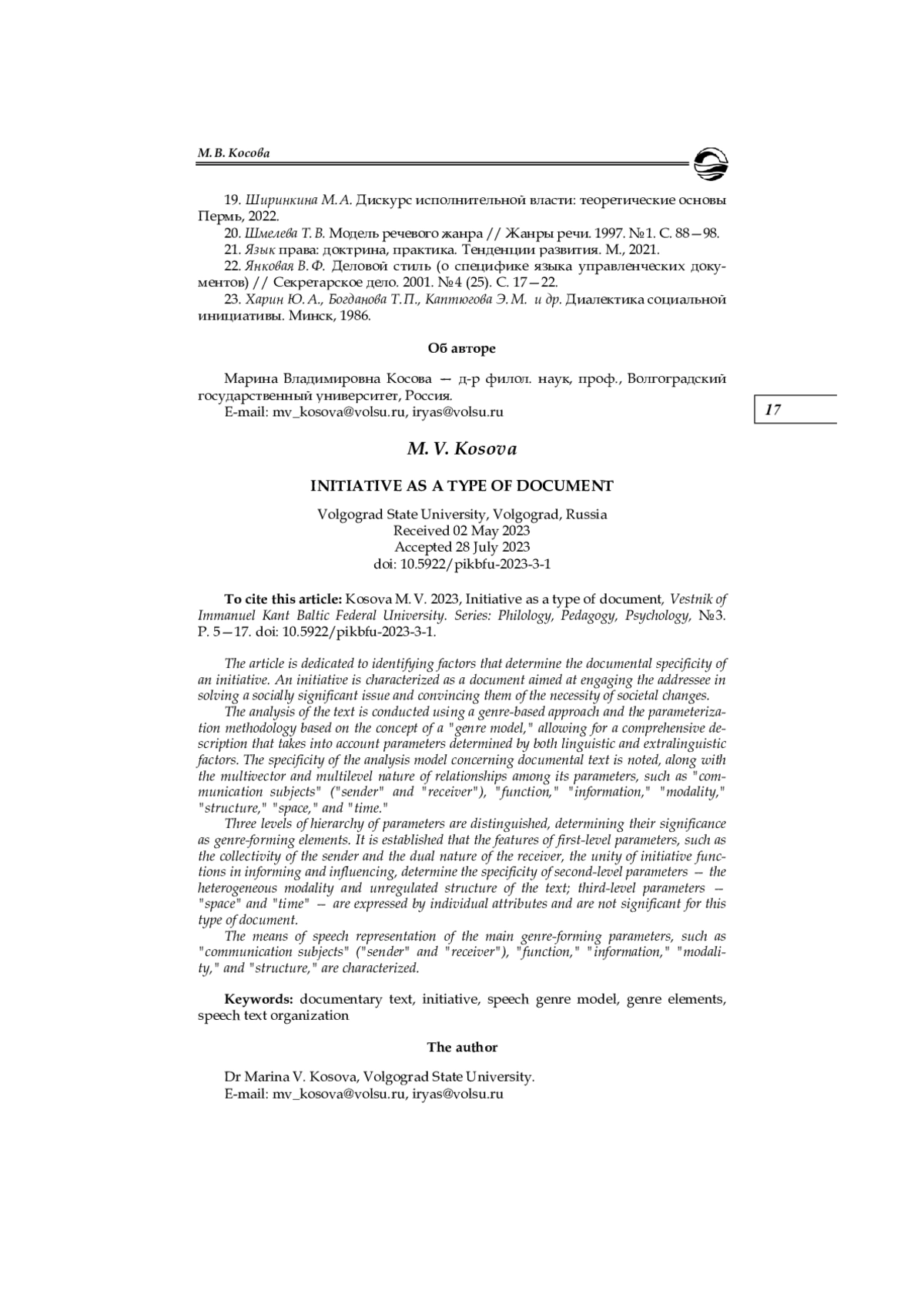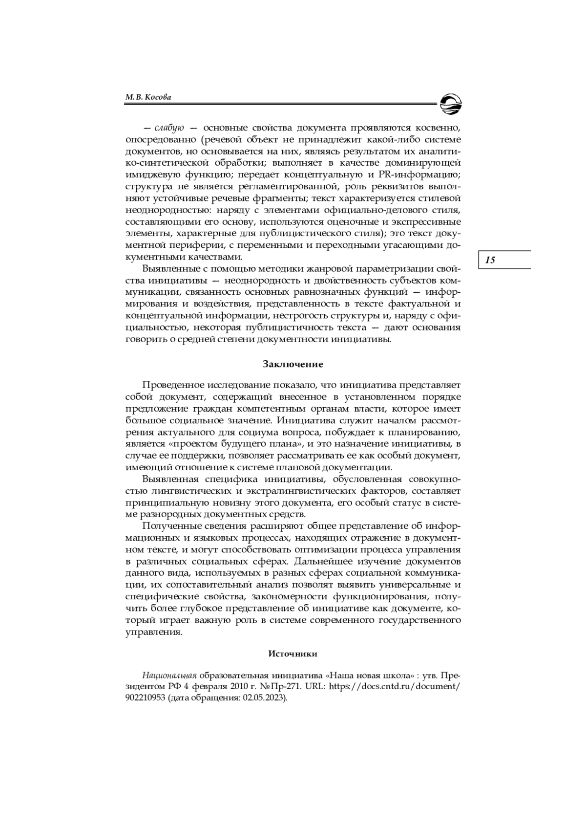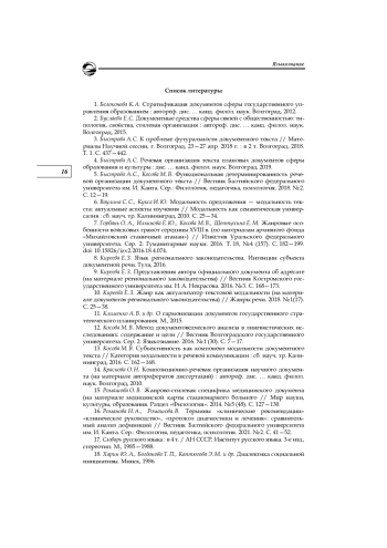 5. Быстрова А. С., Косова М. В. Функциональная детерминированность речевой организации документного текста // Вестник Балтийского федерального университета им. И. Канта. Сер.: Филология, педагогика, психология. 2018. № 2. С. 12-19. EDN: XMHJHF