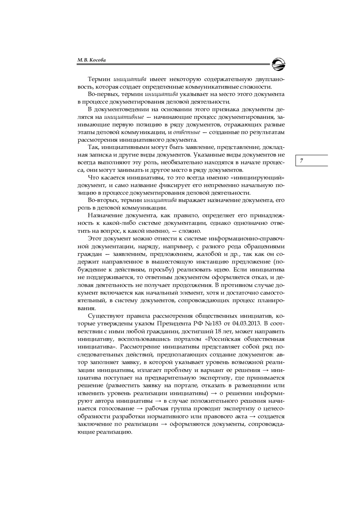 Статья посвящена выявлению факторов, определяющих документоведческую специфику инициативы. Инициатива характеризуется как документ, направленный на привлечение адресата к решению социально значимого вопроса, убеждение в необходимости проводимых в обществе изменений. Анализ текста осуществлен с применением жанрового подхода и использованием методики параметризации с опорой на понятие «модель жанра», что позволяет дать его целостное описание, которое учитывает параметры, обусловленные как лингвистическими, так и экстралингвистическими факторами. Отмечены специфика модели анализа применительно к документному тексту, разновекторный и многоплановый характер связей таких составляющих ее параметров, как «субъекты коммуникации» («адресант» и «адресат»), «функция», «информация», «модальность», «структура», «пространство», «время». Выделены три уровня иерархии параметров, обусловливающие их значимость как жанрообразующих элементов. Установлено, что особенности параметров первого уровня иерархии — коллективность адресанта и двойственный характер адресата, единство функций инициативы по информированию и воздействию — определяют специфику параметров второго уровня — неоднородную модальность и нерегламентированную структуру текста; параметры третьего уровня — «пространство» и «время» — выражены отдельными реквизитами и не являются значимыми для данного вида документа. Охарактеризованы средства речевой репрезентации основных жанрообразующих параметров — «субъекты коммуникации» («адресант» и «адресат)», «функция», «информация», «модальность», «структура»