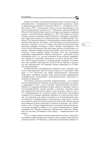 На материале микротопонимов и неофициальных топонимов Руднянского района Смоленской области рассмотрены особенности топонимии смоленско-белорусского приграничья. Материал, полученный в результате опроса жителей района, проанализирован в различных аспектах по выбранным классификациям (по объектам номинации, лексико-семантическим классам, структурным и словообразовательным типам). Отдельно выделены названия с диалектными основаниями. Сделан акцент на роли неофициальных наименований географических объектов в речи жителей региона. Выявлены общерусские черты и специфические особенности приграничной топонимии