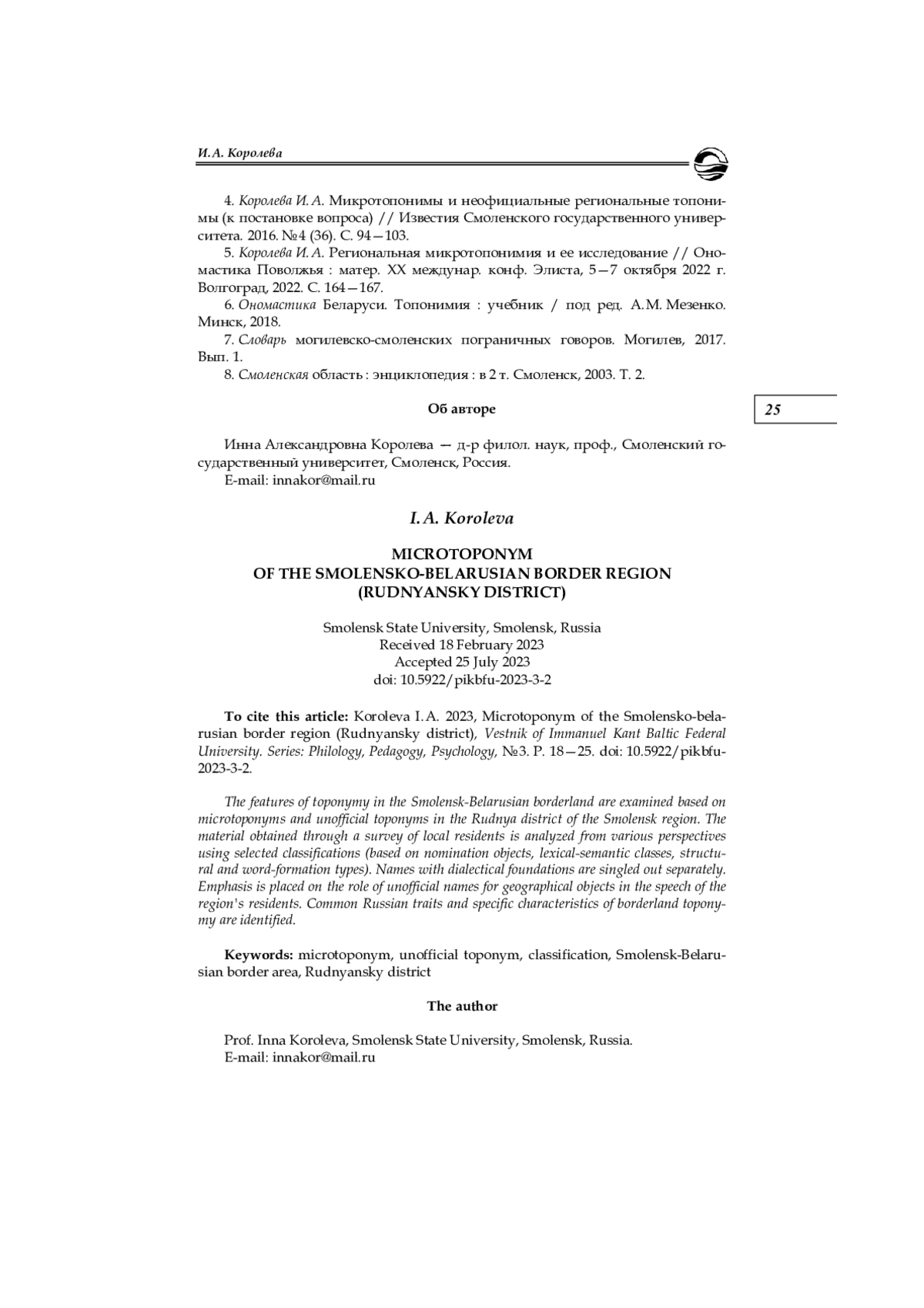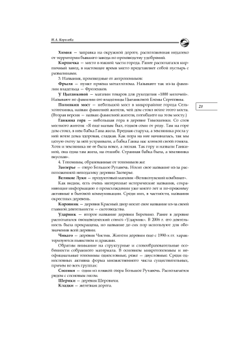 5. Королева И. А. Региональная микротопонимия и ее исследование // Ономастика Поволжья: матер. ХХ междунар. конф. Элиста, 5-7 октября 2022 г. Волгоград, 2022. С. 164-167. EDN: XINSBE