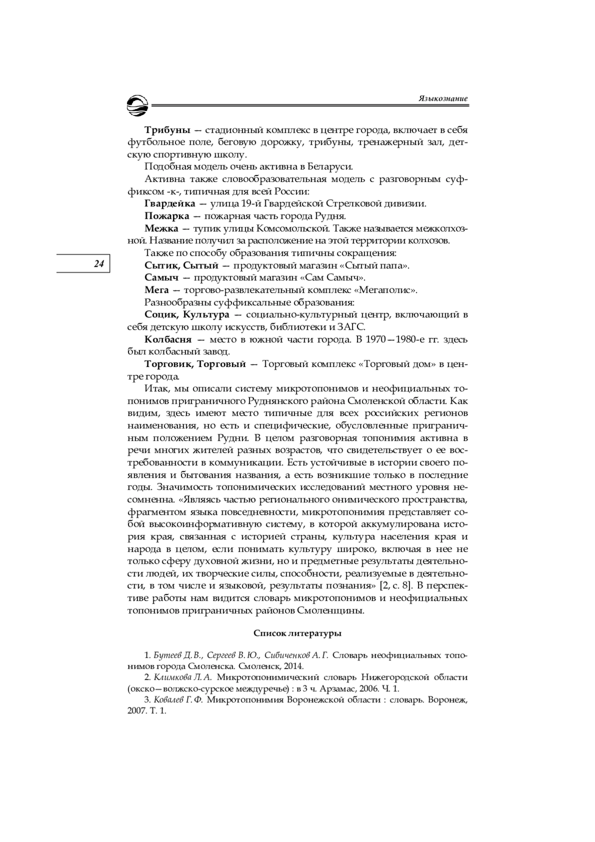 1. Бутеев Д. В., Сергеев В. Ю., Сибиченков А. Г. Словарь неофициальных топонимов города Смоленска. Смоленск, 2014.