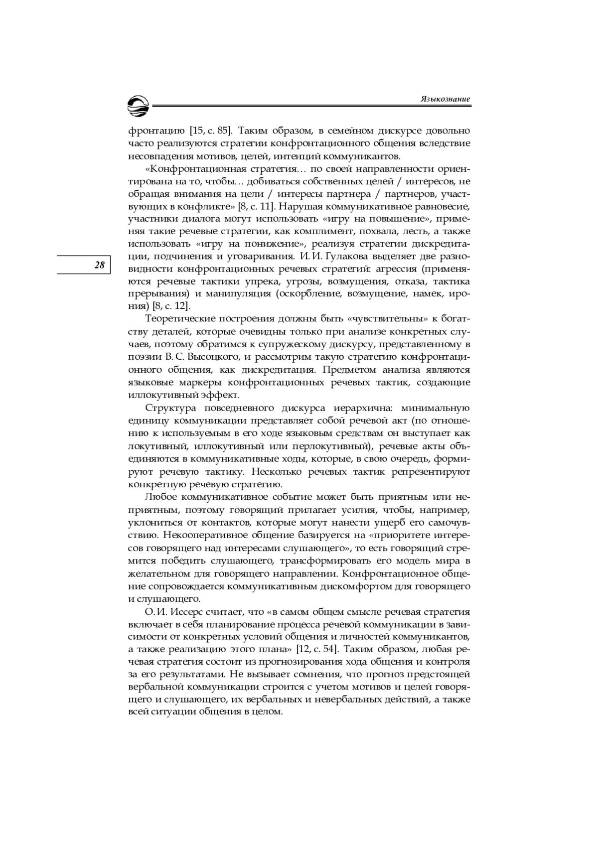 8. Гулакова И. И. Коммуникативные стратегии и тактики речевого поведения в конфликтной ситуации общения: автореф. дис. … канд. филол. наук. Орел, 2004. EDN: NHOKTL