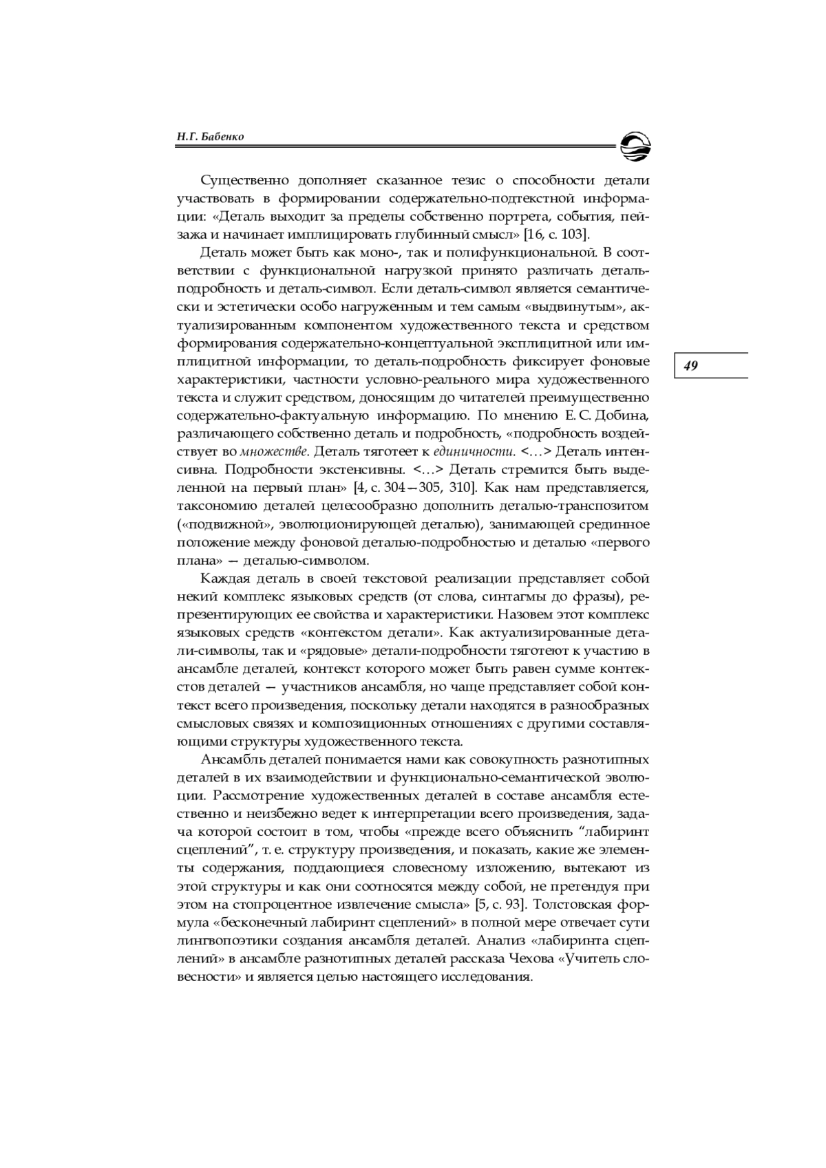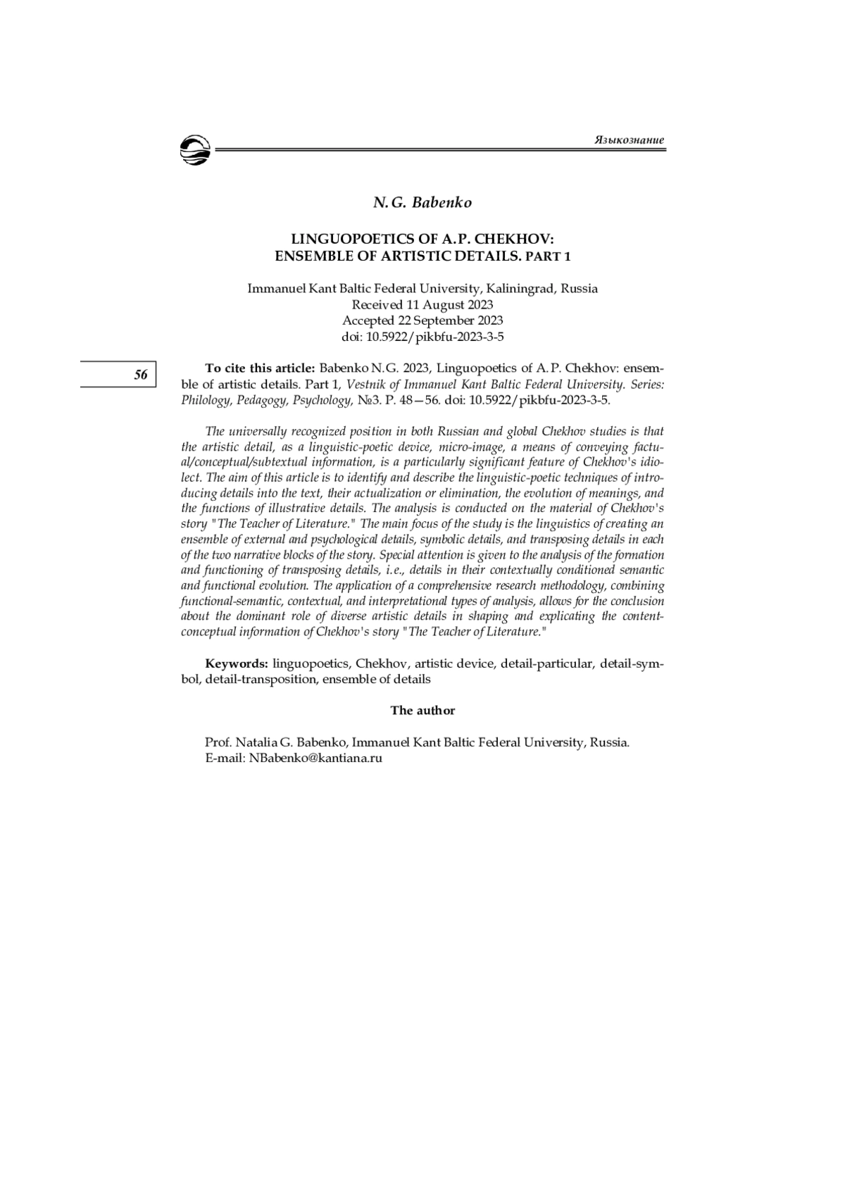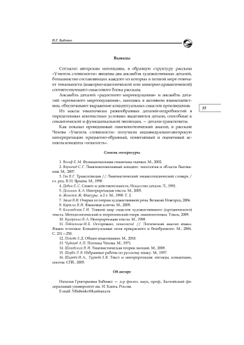 Общепризнанным в отечественном и мировом чеховедении является положение о том, что художественная деталь как лингвопоэтический прием, микрообраз, средство передачи фактуальной / концептуальной / подтекстной информации — особо значимая черта идиостиля Чехова. Цель настоящей статьи — выявление и описание лингвопоэтических приемов введения деталей в текст, их актуализации или элиминации, эволюции значений и функций изобразительных подробностей. Анализ проведен на материале рассказа Чехова «Учитель словесности». Основным предметом рассмотрения стала лингвопоэтика создания ансамбля внешних и психологических деталейподробностей, деталей-символов и деталей-транспозитов в каждом из двух смысловых блоков рассказа. Особое внимание уделено анализу образования и функционирования деталей-транспозитов, то есть подробностей в их контекстуально обусловленной семантической и функциональной эволюции. Применение комплексной методики исследования, сочетающей функционально-семантический, контекстологический, интерпретационный виды анализа, позволило прийти к выводу о доминирующей роли разнотипных художественных деталей в формировании и экспликации содержательно-концептуальной информации рассказа Чехова «Учитель словесности»