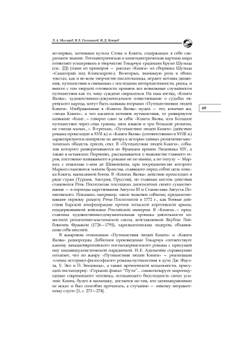 Творчество польской писательницы Ольги Токарчук (р. 1962), Нобелевского лауреата по литературе от 2018 г., представляет собой систему сквозных мотивов, отражающих целостное мировидение автора. Связность текстов, созданных прозаиком, наиболее очевидна в сопоставлении ее дебютного романа «Путешествие людей Книги» («Podróż ludzi Księgi», 1992)1 и объемного эпического полотна «Книги Якова» («Księgi Jakubowe», 2014)2.