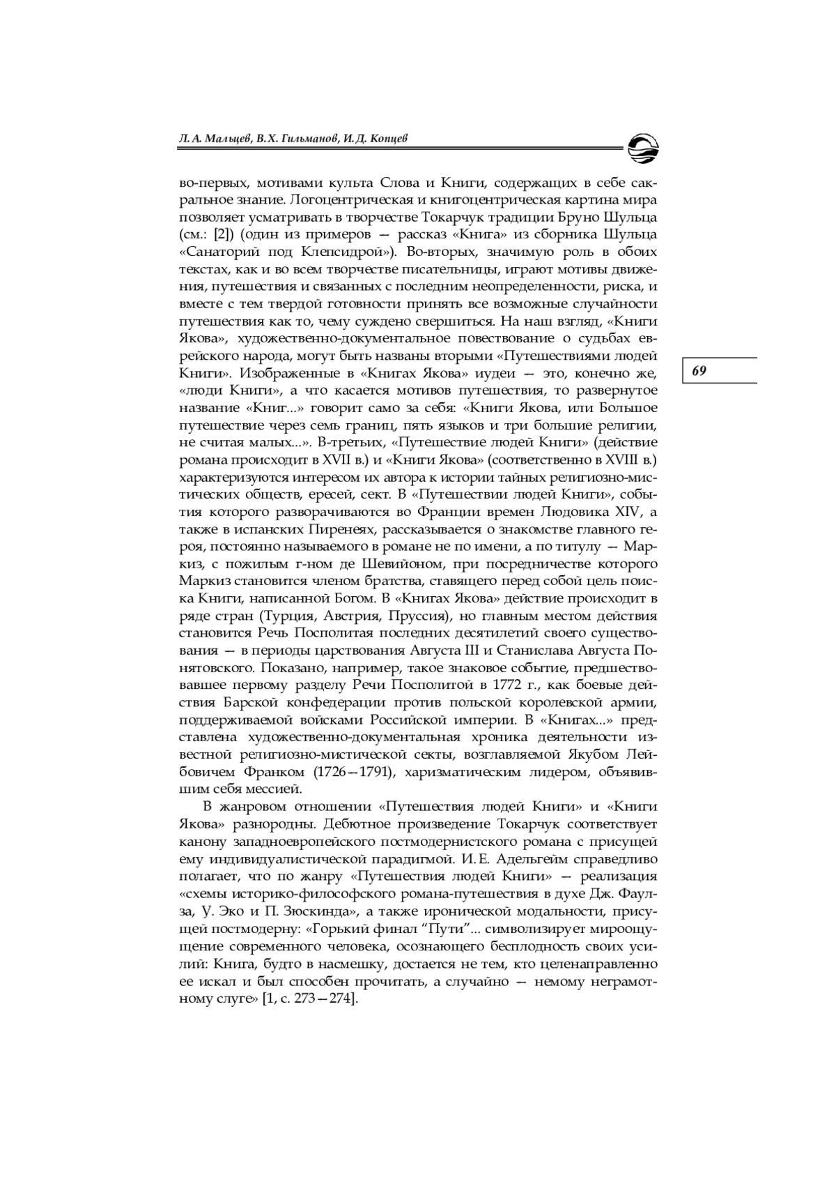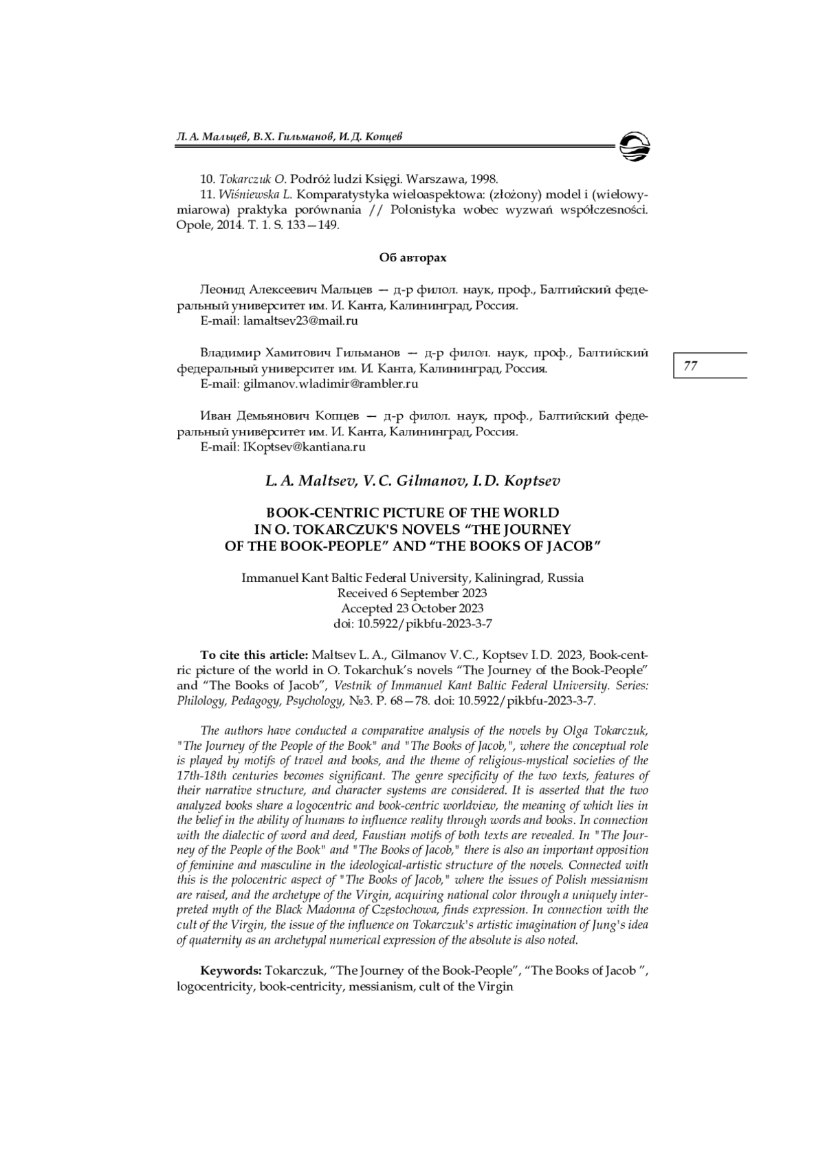 Проведен сравнительный анализ романов Ольги Токарчук «Путешествие людей Книги» и «Книги Якова», в которых концептуальную роль играют мотивы путешествия и книги, а тематика религиозно-мистических обществ XVII—XVIII вв. приобретает большое значение. Рассмотрены жанровая специфика двух текстов, особенности их повествовательной структуры и системы персонажей. Утверждается, что две анализируемые книги сходны логоцентрическим и книгоцентрическим мировидением, смысл которого заключается в вере в способность человека с помощью слова и книги оказывать влияние на действительность. В связи с диалектикой слова и дела раскрываются фаустовские мотивы обоих текстов. В «Путешествии людей Книги» и в «Книгах Якова» также присутствует важная для идейно-художественной структуры романов оппозиция женское — мужское. С ней связан полоноцентрический аспект «Книг Якова», в которых ставится проблематика польского мессианизма и находит выражение архетип Девы, приобретающий национальный колорит благодаря своеобразно интерпретированному мифу Богоматери Ченстоховской. В связи с культом Девы также отмечена проблема воздействия на художественное воображение Токарчук идеи Юнга о четверичности как архетипическом числовом выражении абсолюта
