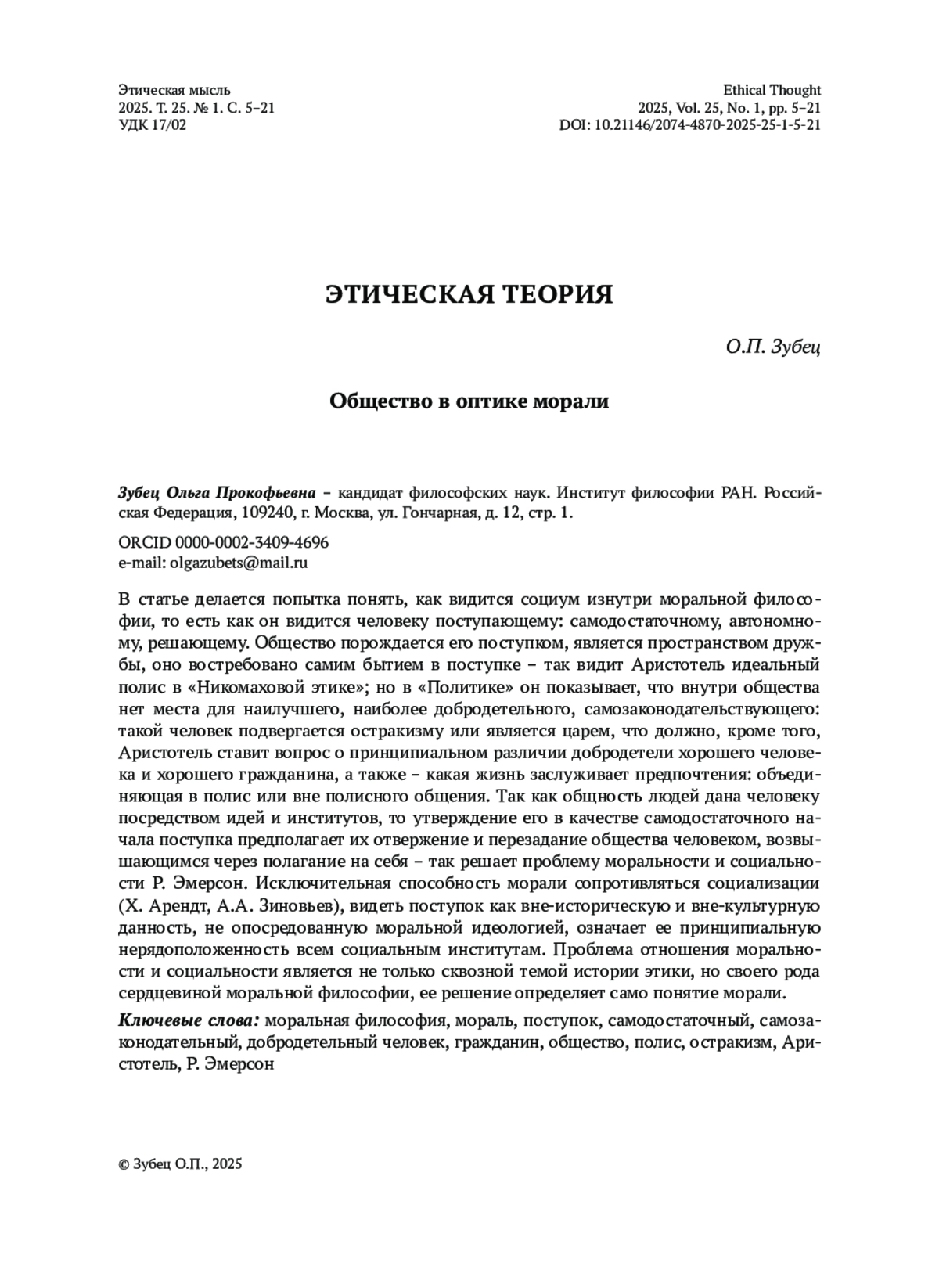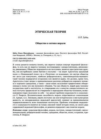 В статье делается попытка понять, как видится социум изнутри моральной философии, то есть как он видится человеку поступающему: самодостаточному, автономному, решающему. Общество порождается его поступком, является пространством дружбы, оно востребовано самим бытием в поступке – так видит Аристотель идеальный полис в «Никомаховой этике»; но в «Политике» он показывает, что внутри общества нет места для наилучшего, наиболее добродетельного, самозаконодательствующего: такой человек подвергается остракизму или является царем, что должно, кроме того, Аристотель ставит вопрос о принципиальном различии добродетели хорошего человека и хорошего гражданина, а также – какая жизнь заслуживает предпочтения: объединяющая в полис или вне полисного общения. Так как общность людей дана человеку посредством идей и институтов, то утверждение его в качестве самодостаточного начала поступка предполагает их отвержение и перезадание общества человеком, возвышающимся через полагание на себя – так решает проблему моральности и социальности Р. Эмерсон. Исключительная способность морали сопротивляться социализации (Х. Арендт, А. А. Зиновьев), видеть поступок как вне-историческую и вне-культурную данность, не опосредованную моральной идеологией, означает ее принципиальную нерядоположенность всем социальным институтам. Проблема отношения моральности и социальности является не только сквозной темой истории этики, но своего рода сердцевиной моральной философии, ее решение определяет само понятие морали.